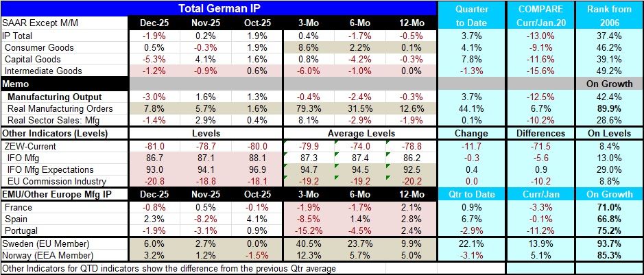 Broader IP trends in Germany and elsewhere in Europe As for other early industrial production reporters, both Sweden and Norway showed strong-to-solid gains in December and each of them showed two-months of gains in a row. Beyond that, sequential growth rates from 12-months to six-months to three-months show accelerating growth in German consumer goods output against decelerating growth for intermediate goods. Real manufacturing output and real sales show mixed results- no clear trends; however, real manufacturing orders in Germany are off the map strong.