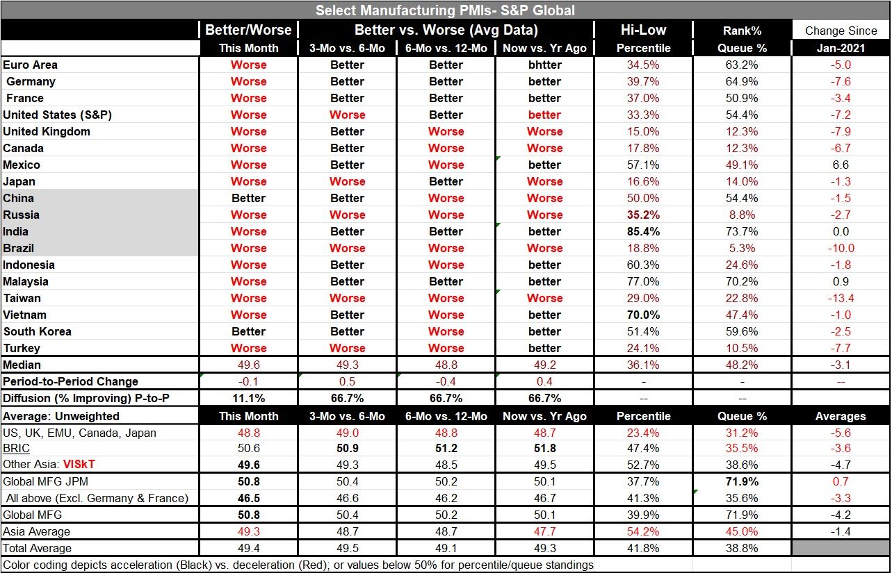 The queue rankings, however, indicate there's still a great deal of weakness with ten of the reporting countries having PMI readings since January 2021 that are below their respective medians. Output is above the respective medians for eight countries.