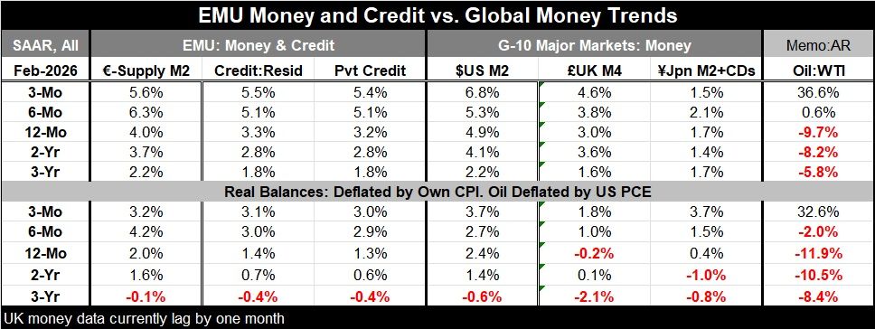 Current global money and credit trends Money supply growth accelerated in February over three months compared to six months in the United States and the United Kingdom. In the EMU, money growth backed down from a 6.3% growth rate over six months to a still hot 5.6% over three months. Japan, as always, was the exception, with money growth sinking to a weak 1.5% over three months from 2.1% over six months. And the Bank of Japan still has its sights on raising rates further and bringing the level of interest rates eventually to a normalized level. In the EMU, credit growth accelerated as private credit grew at a 5.4% pace over three months, up from 5.1% over six months.