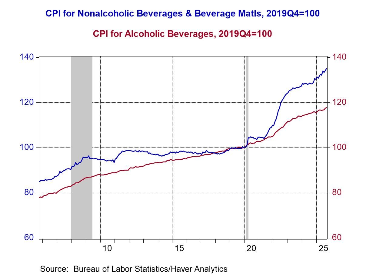 Chart 10 shows that prices of alcoholic beverages have risen roughly twice as fast as prices of nonalcoholic beverages since pre-Covid. This finding may run counter to preconceived notions that demand for alcoholic beverages rose significantly during Covid. Most likely, it’s the high costs of labor and sugar that go into nonalcoholic beverages that makes the difference.