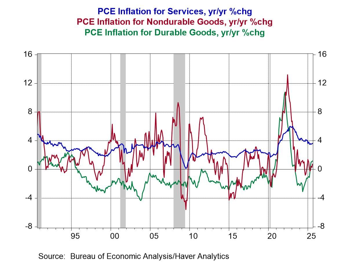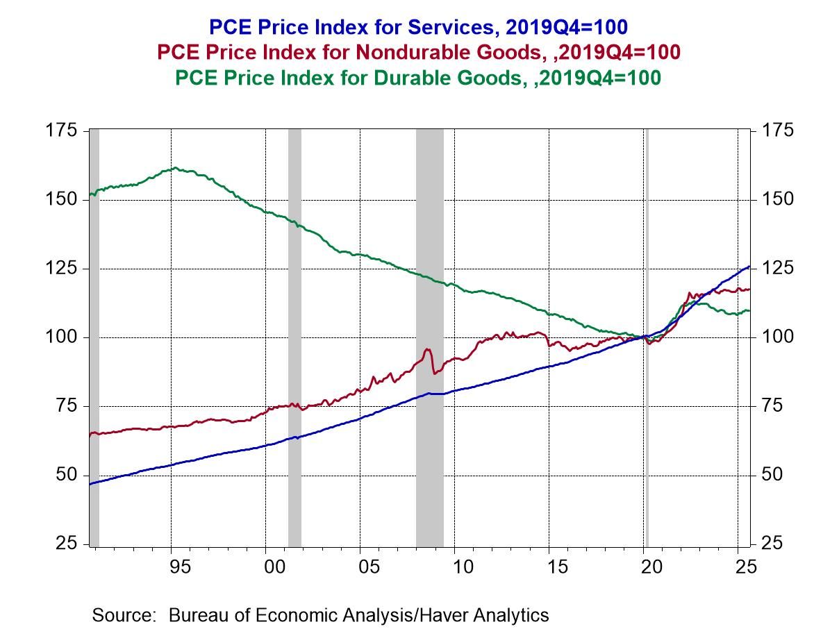 Those trends in inflation have shifted distinctly since Covid. Services inflation has continued, but at a markedly higher pace. Inflation of durable and nondurable goods surged through 2023 and since then prices of durables have fallen while prices of nondurables have been flat.