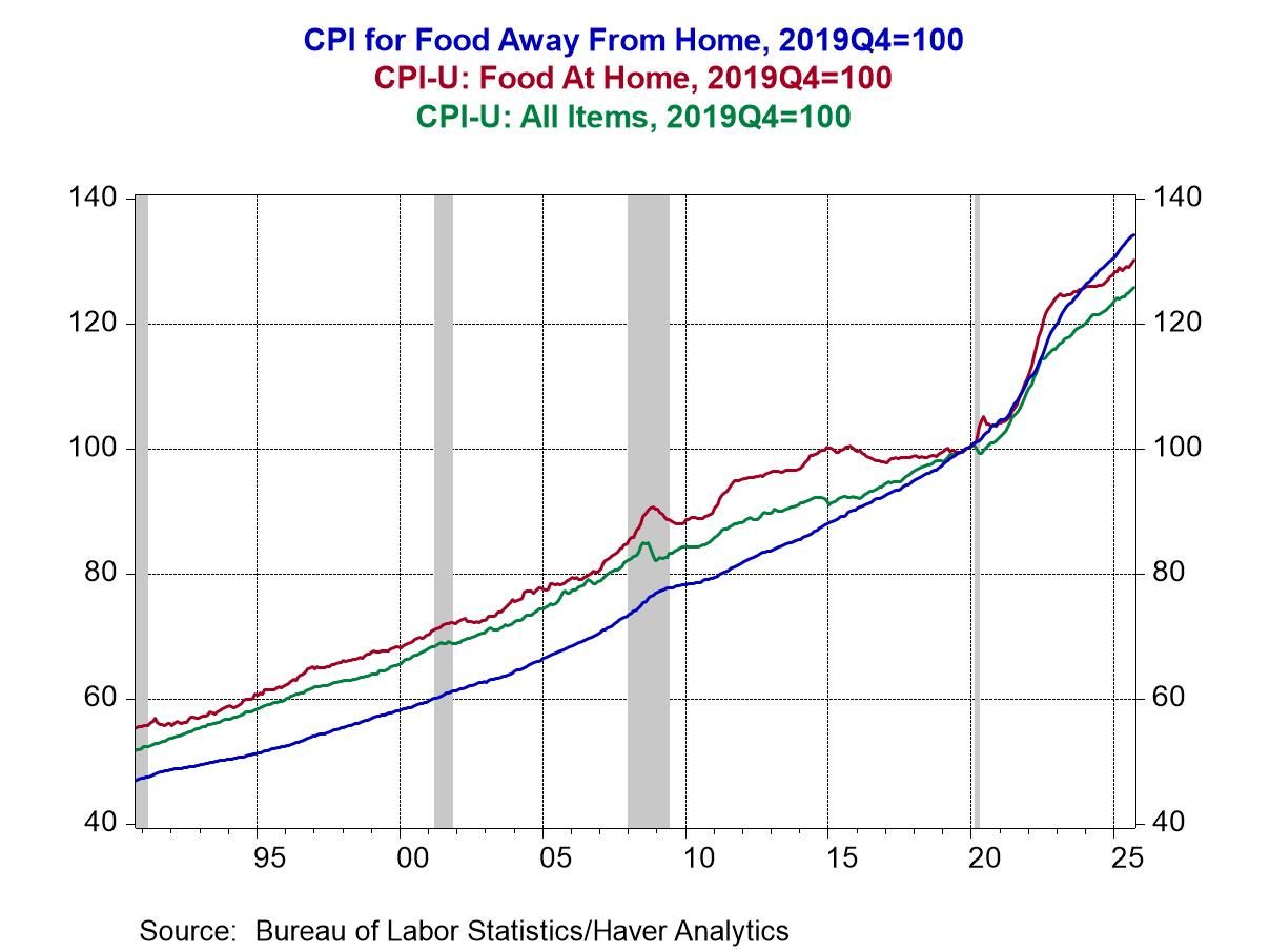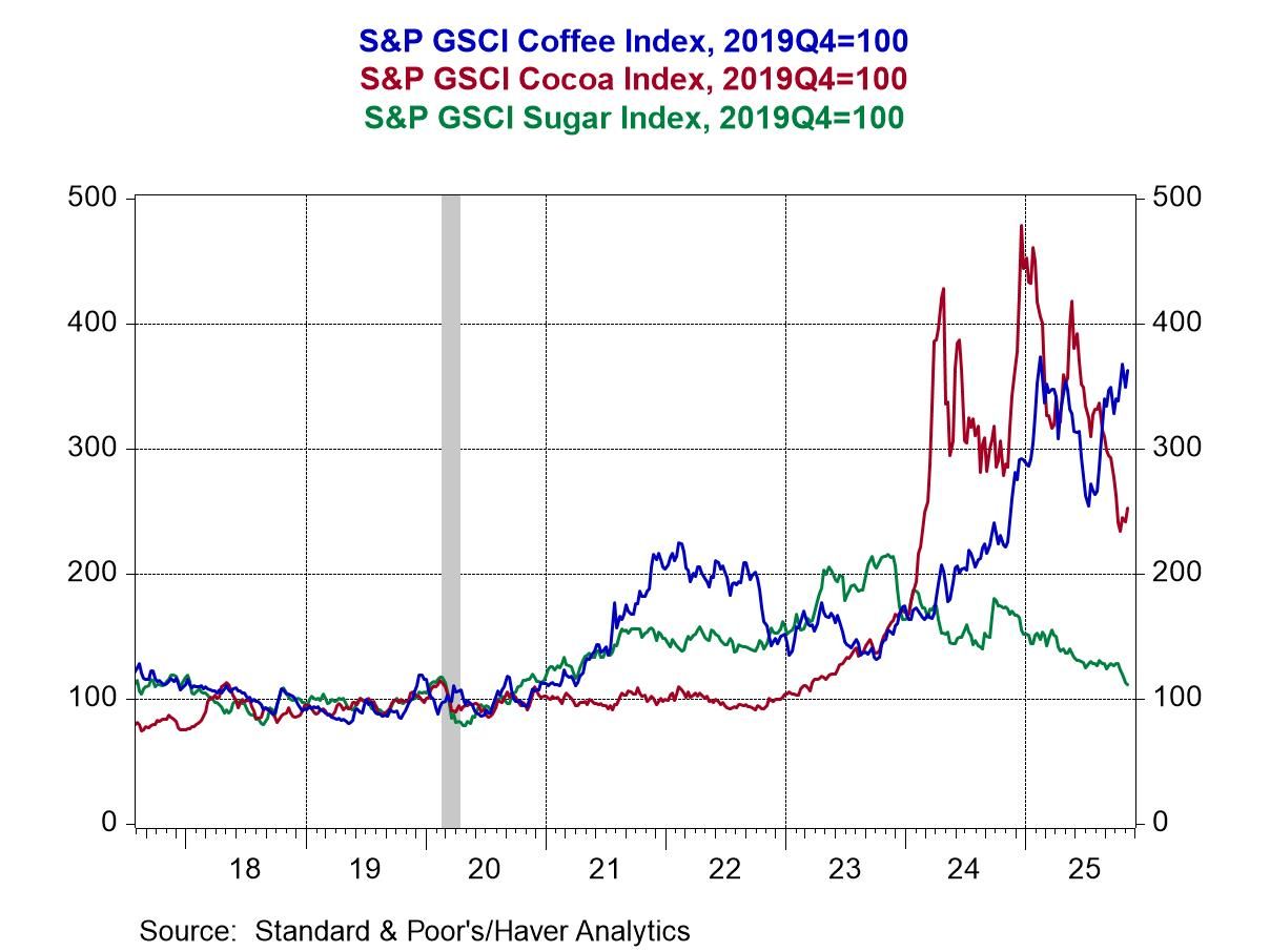 Bad news for coffee drinkers: coffee futures are up 380% from their 2019Q4 price (Chart 9). The largest purveyors of coffee hedge their costs of future supplies of coffee, but nevertheless pass on the costs to consumers. Still, brewing a cup of coffee at home is far less expensive than purchasing one at a coffee shop. Similar bad news for those who consume chocolate products: cacao prices soared through 2024 and have since fallen but remain nearly 250% of their pre-covid level. Sugar prices nearly doubled from 2019Q4 through 2024, but since then they have fallen back close to its pre-covid level.