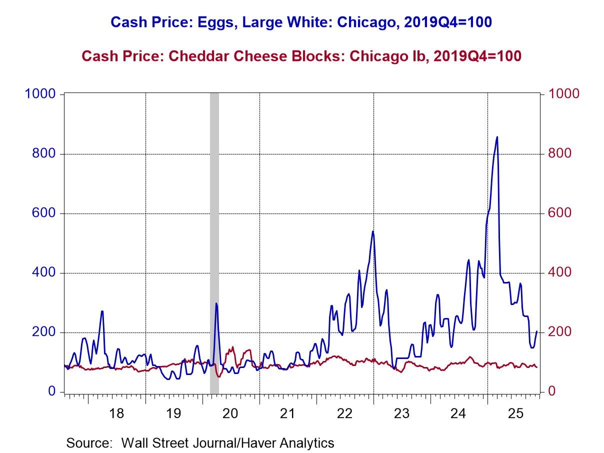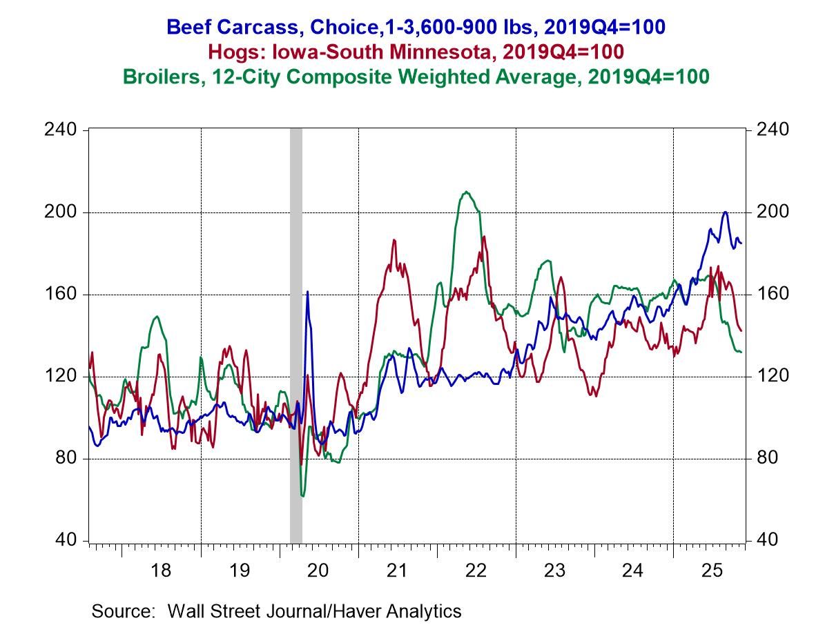 Prices of cheese (and butter, not shown) have fallen. Eggs are another story: their prices soared over 800% in early 2025 and have receded sharply, but remain double their pre-Covid prices. Beef prices have doubled since pre-covid, while the cumulative price increase of poultry has been modest (Chart 8).