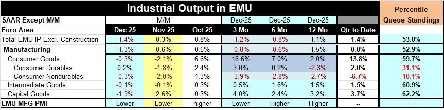 Industrial output in the European monetary union fell by 1.4% in December. Manufacturing output fell by 1.3%. Output of consumer goods fell by 0.3%, output of intermediate goods fell by 0.1%, and output of capital goods fell by 1.9% in December. The subsector, consumer durables, showed an increase in output of 0.2% in December. Headline and manufacturing output in December reversed the increases seen in October and November. However, consumer goods, consumer nondurables, and intermediate goods saw two consecutive months of output declines for November and December.