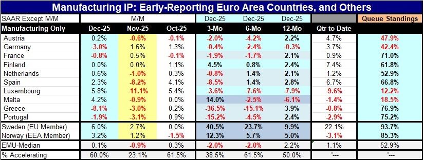 In addition, these sequential data show that five reporting countries have persistent decelerations in output growth rates from 12-months to 6-months to 4-months. Those countries include France, the Netherlands, Spain, Greece, and Portugal. However, there are contrary accelerating trends in three reporting countries Malta, Sweden, and Norway; the latter two, of course, are not monetary union members but have various affiliations with the European trading bloc.