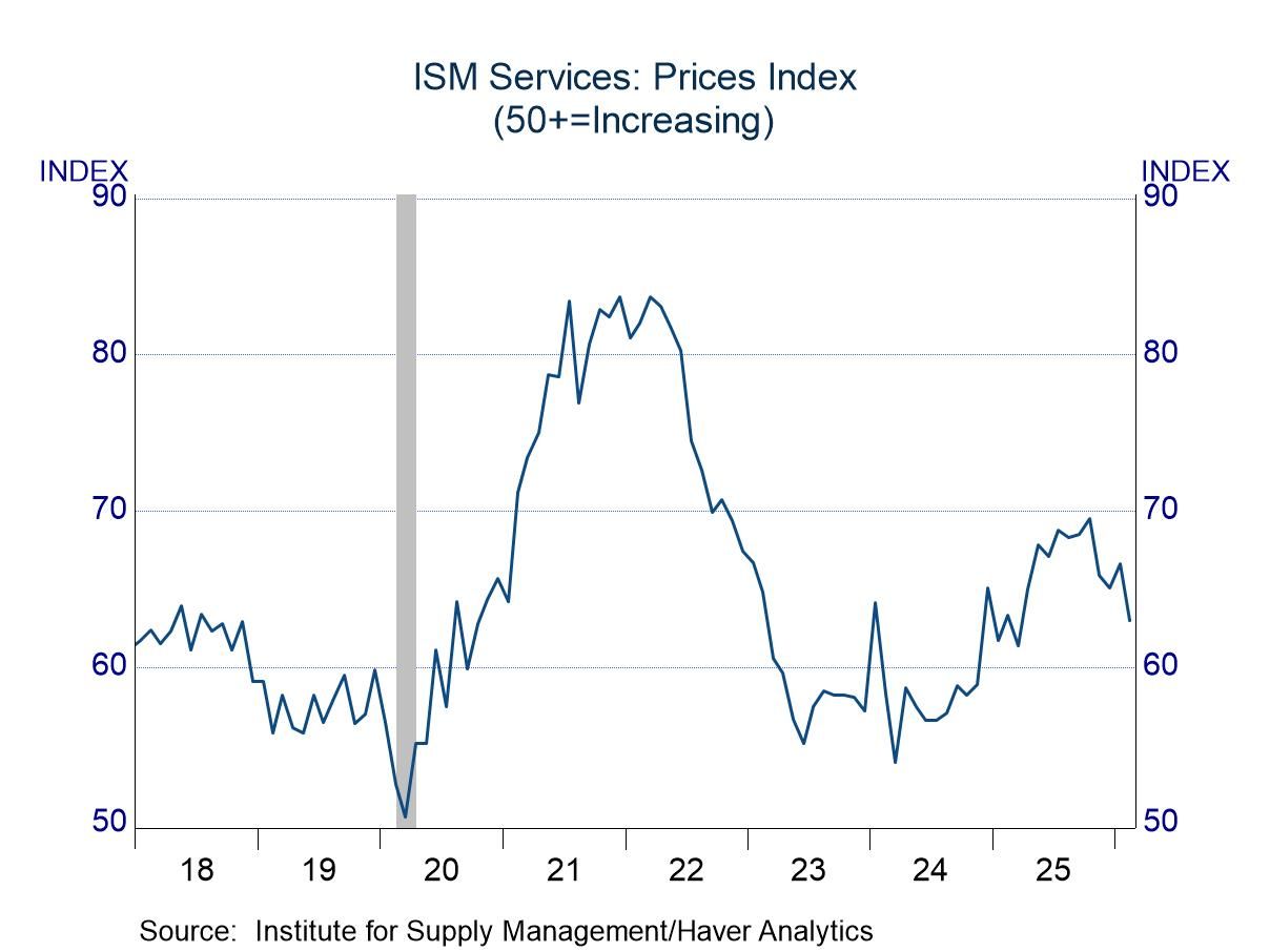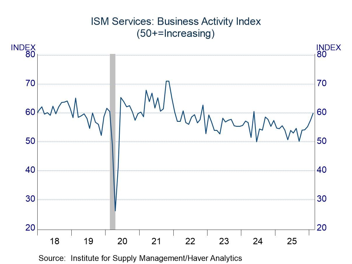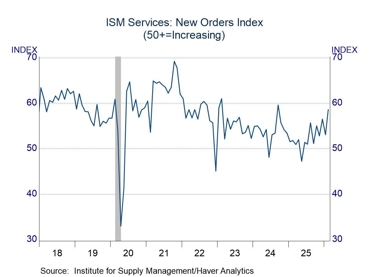 The new orders index made the largest contribution to the advance in the headline measure, jumping 5.5 points to 58.6, moving to the upper end of the range of the past few years. With order flows firm, business activity remained brisk, as this component rose 2.5 points to 59.9. Business activity recovered quickly from the pandemic and has been above 50 since June 2020. The latest reading was in the upper portion of the range in place since 2022. The employment index was a bit of a laggard, as it rose only 1.5 points, and its level of 51.8 was light relative to the other components. Still, the latest reading was encouraging, as it marked the third consecutive month above 50, representing a break from the sub-50 results that were common in 2024 and 2025.