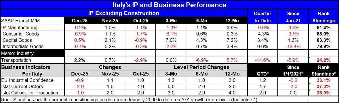 Indicators and surveys The bottom panel of the table presents performance by surveys; these tend to be more up-to-date, and they've come to be relied upon. Here we feature indicators from the EU industrial survey and from Istat on current orders and on the outlook for current production. In December, all three of these metrics showed declines; in November they all showed increases, and they showed increases in October similar to the increases logged in November. The changes in the levels of the variables over different horizons show a mild tendency toward weakening, but nothing that is clear or dramatic, looking at changes from 3-months. to 6-months, to 12-months. In the just-completed quarter (QTD), the change in the indicators is either flat or lower. All of them track below their historic median levels (rankings <50). The indicators clearly are showing weaker conditions than actual production data. These sorts of rifts are common between accounting data and survey-style diffusion data. They also generate controversy about which is right. I favor the accounting data.