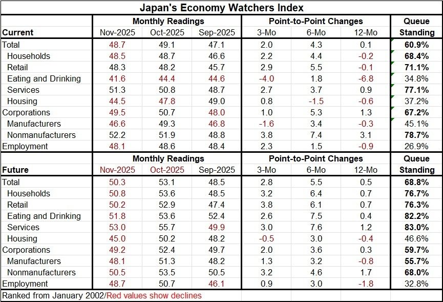 In November, the current index declined in the headline as well as in six components, with only three components showing improvement month-to-month. The three showing improvement were retailing, services, and nonmanufacturers.