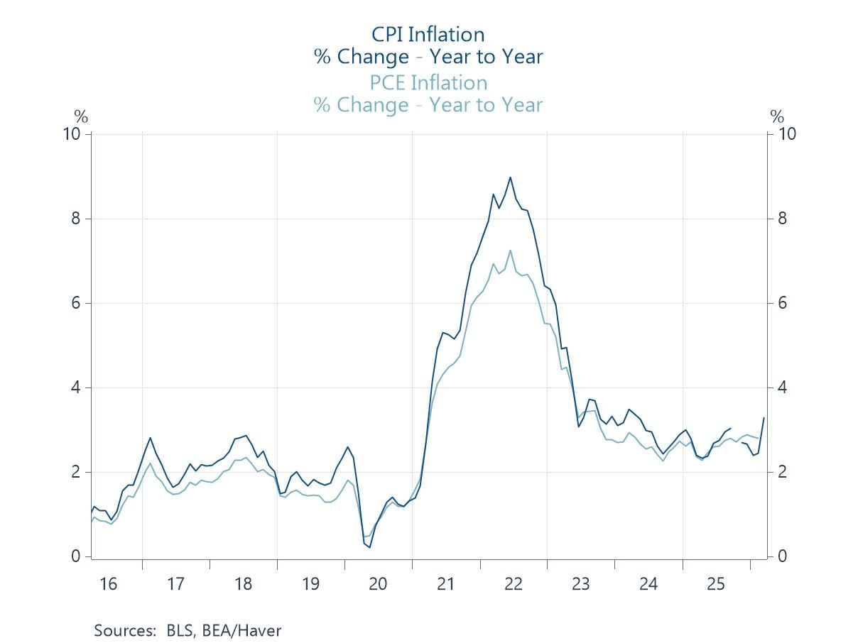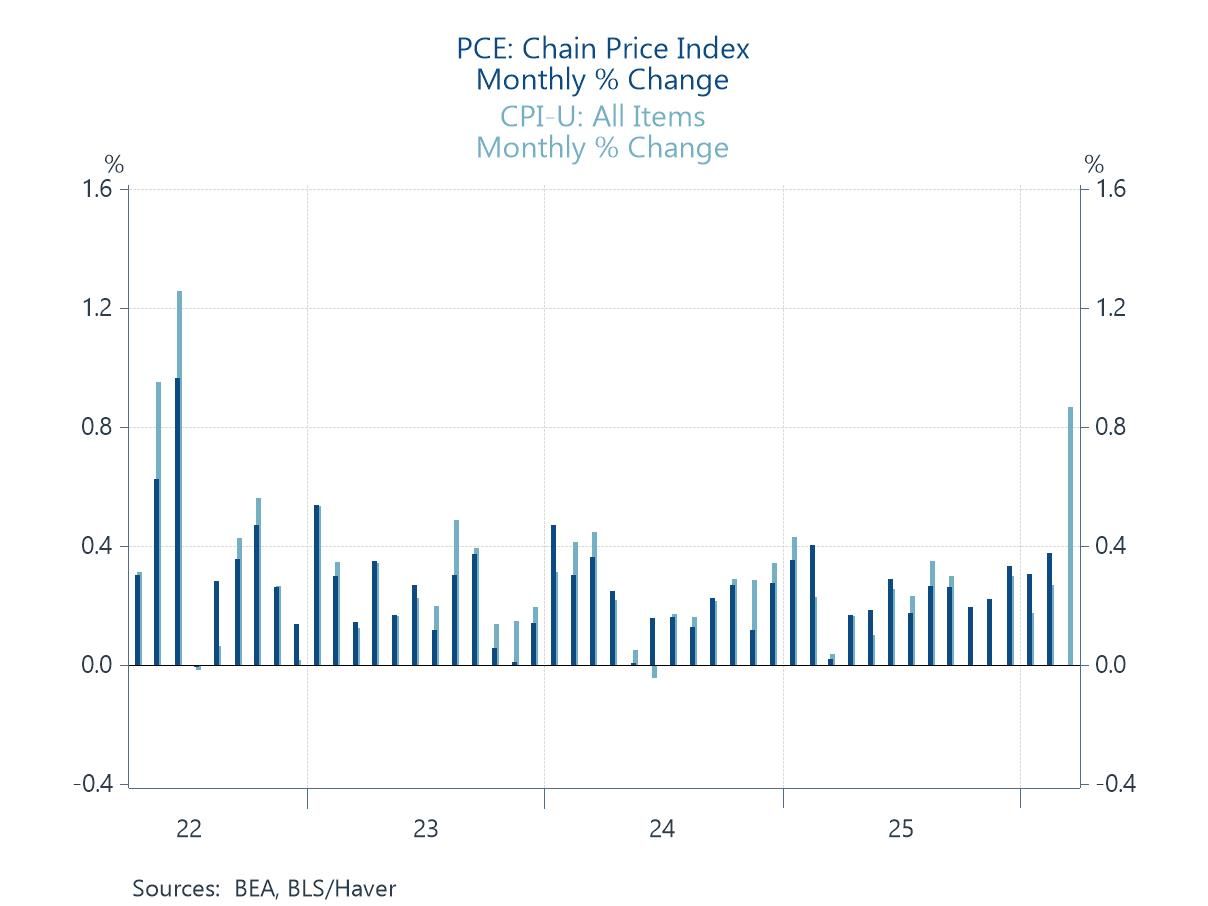 PCE inflation was 2.8% yr/yr through February 2026 before the Middle East conflict began and oil prices spiked, and core PCE inflation excluding food and energy was 3.0%, while CPI inflation was 2.4% and 2.5% excluding food and energy. The Fed’s preferred measure of inflation is the PCE and it equates 2% PCE inflation to price stability. The CPI measures a narrower mix of goods and services than the PCE: by excluding goods and services that are paid for by third parties, including Medicare, Medicaid and employer-financed health insurance, it is the best measure of consumer out of pocket expenses. Basically, the CPI has a much heavier weighting of shelter costs--rental costs and OER--and a much lower weighting of health care services than the PCE. The rationale for the core measures of inflation is twofold: the food and energy components tend to be volatile, and earlier empirical research showed that core inflation (rather than headline inflation) is a more accurate predictor of future headline inflation (I have not seen any updated empirical research on this).