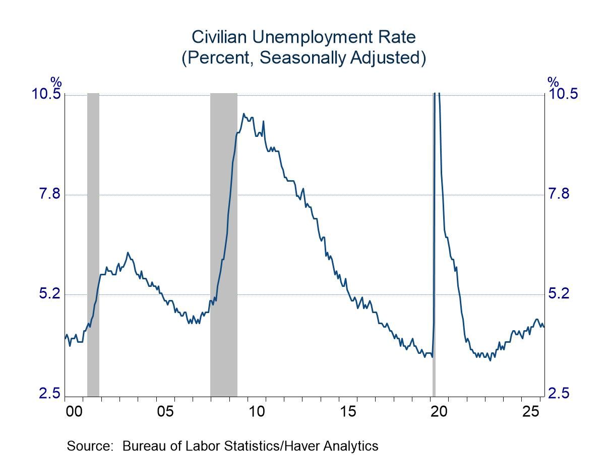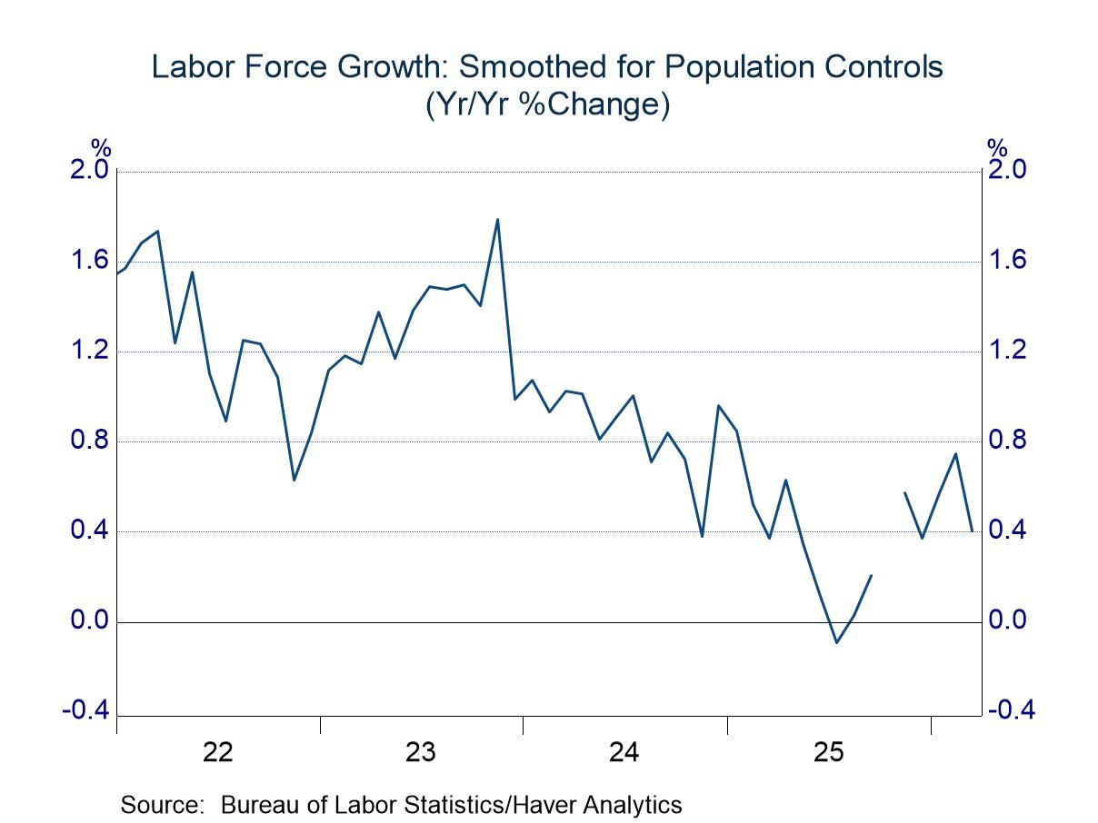 However, Haver Analytics maintains a smoothed series originally developed by BLS to eliminate the breaks in the labor force data. As shown in the chart below, the smoothed series on the size of the labor force had been growing at a pace centered on 1.2% through 2022, but it has slowed irregularly since then (an observation for October is not available because of limited data collection during the government shutdown). The overall labor force is still growing, but the slower pace means fewer individuals looking for work, which most likely results in fewer being counted as unemployed.