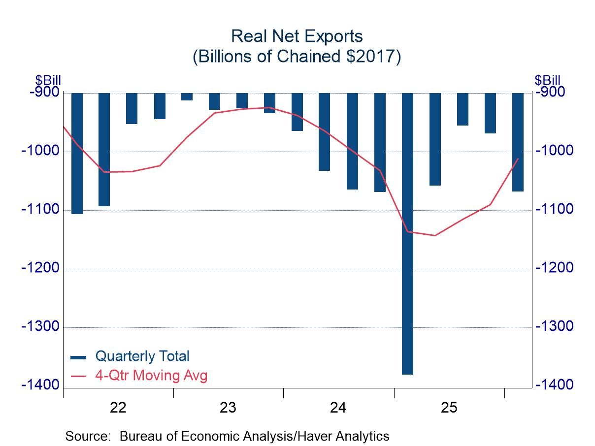 International trade acted as a drag on economic growth in Q1, with net exports subtracting 1.3 percentage points from the GDP increase. Exports did well in the first quarter with growth of 12.9%, but imports were even stronger with a jump of 21.4%. The real trade deficit of $1.1 trillion was noticeably smaller than the shortfall of $1.4 trillion in 2025-Q1 when importers were rushing to get goods into the US before the imposition of tariffs. Still, the trade shortfall was sizeable and its effect on growth noticeable.