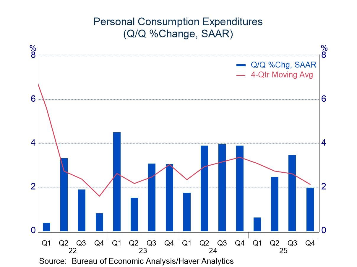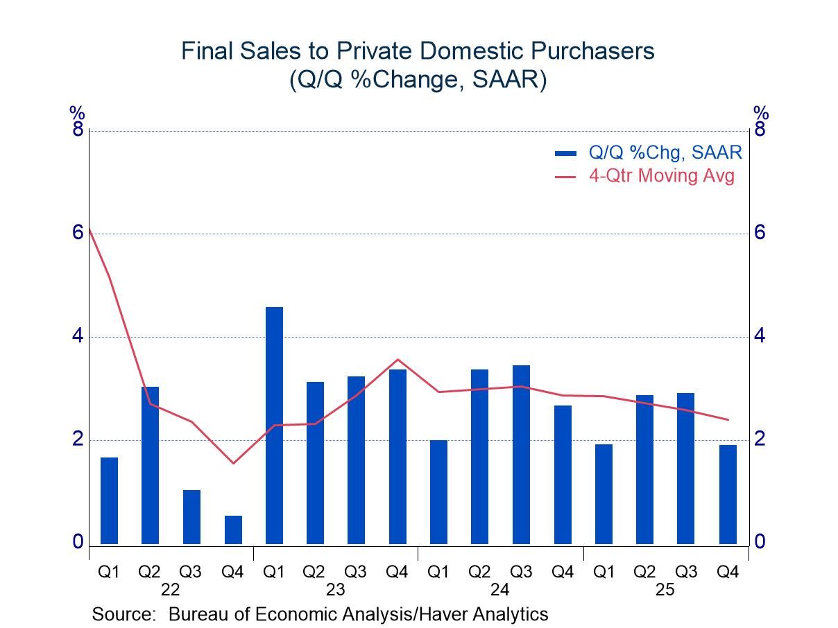 Although the pace of PDFD was respectable, it was the source of most of the downward revision to GDP growth, with the new figure one-half percentage point off the initial estimate of 2.4%. Consumer spending made the largest contribution to the downward revision with growth slowing from 2.4% to a still-respectable 2.0%. Most of the adjustment occurred in the service area, but spending on services remained firm with growth of 2.7%.