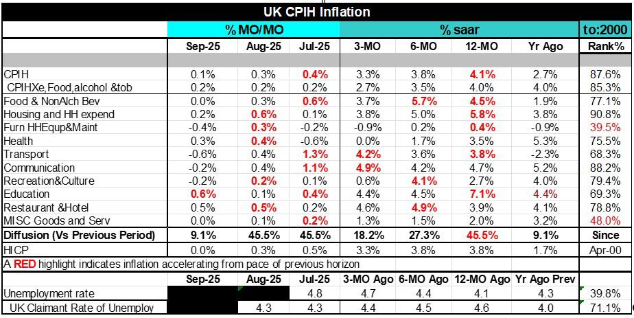 Inflation in the UK rose by 0.1% according to the CPI headline in September. This was a step down from the 0.3% increase in August. The core CPI-H (excluding, energy, food, alcohol, and tobacco) rose by 0.2% in September, the same as in August and in July. Sequentially the CPI-H rose 4.1% over 12-months, rose at a 3.8% annual rate over six-months, and rose at a 3.3% annual rate over 3-months for the headline CPI-H. That marks a clear decelerating pattern from 12-months to 6-months to 3-months. That same phenomenon is reproduced by the core, where the year-over-year inflation rate is 4% ,the 6-month annual rate drops to 3.5%, and the 3-month rate drops again to 2.7%.