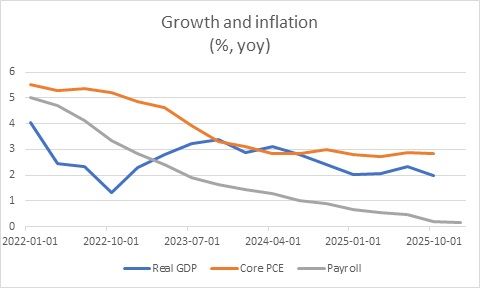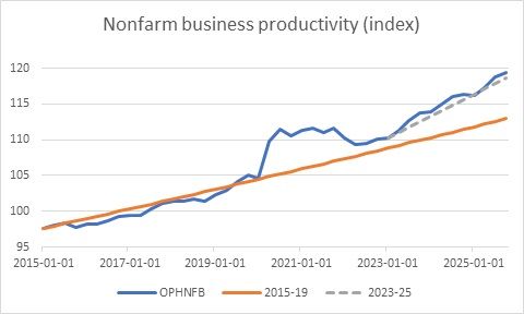 Coming into 2025 both growth and inflation were trending down. On net, Administration policies seem to have caused a leveling off inflation, while contributing to slower growth, particularly in the labor market inflation (chart). On the other hand, I think the trend growth in productivity has improved, first from the business response to COVID and over time due to Artificial Intelligence.