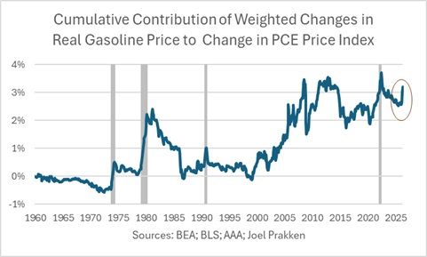 The resulting series (chart) is the cumulative contribution in percentage points of changes in the real price of gasoline to the cumulative change in the price index for PCE. I’ve grey-barred four earlier episodes associated with geopolitical upheaval in the Middle East and Eastern Europe: the OPEC oil embargo in 1973; the Iranian revolution in 1979; the Gulf War in 1990; and the Russian invasion of Ukraine in 2022.