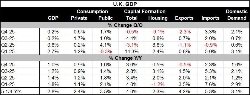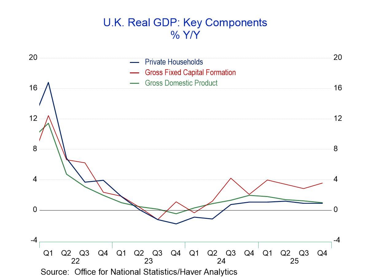 U.K. GDP slowed to a crawl at the end of the year, with growth at a 0.2% (annualized) rate logged in both the third and fourth quarters as 2025 drew to a close. The year had started with a strong 2.7% growth rate in Q1, which slipped to a 0.8% pace in the second quarter and decelerated to negligible growth at the end of the year.