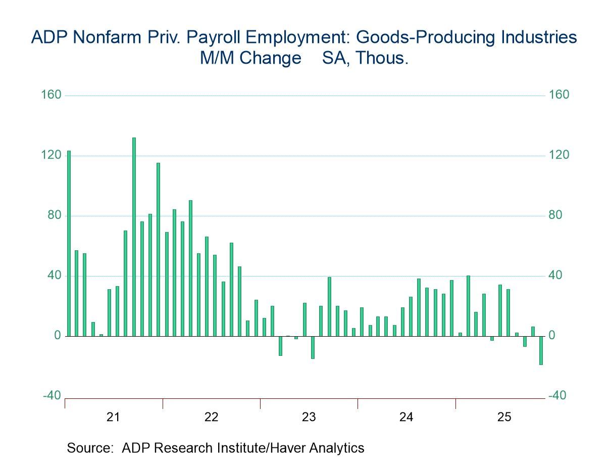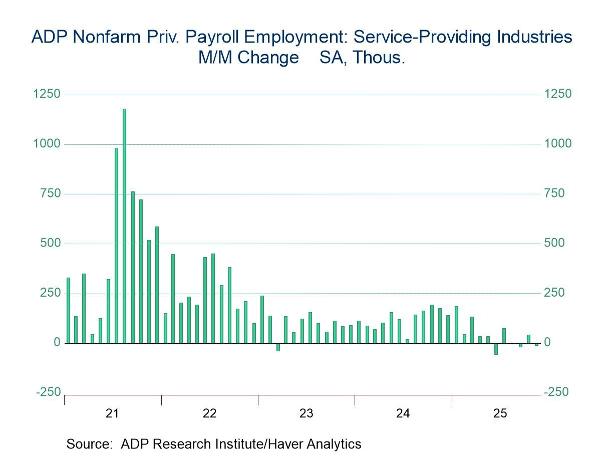 The ADP National Employment Report indicated that nonfarm private sector payrolls during November declined 32,000 (+0.6% y/y) after increasing 47,000 in October, revised from 42,000, following an unrevised 29,000 September decline. The three-month average change of -5,000 compares to +24,000 in Q3’25, 22,000 in Q2 and 139,000 in Q1. The Action Economics Forecast Survey expected a 10,000 increase in November.