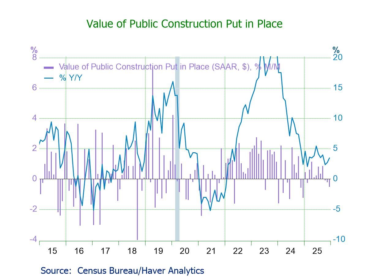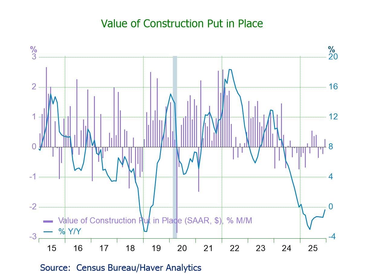 The value of construction put in place rose a slightly-more-than-expected 0.3% m/m in December to a seasonally adjusted annual rate of $2,168.8 billion, reversing declines of 0.2% in November and 0.1% in October (+0.5% previously), data from the U.S. Census Bureau showed. December marked the first m/m gain since August and the highest level in three months. A 0.2% m/m increase had been expected in the Action Economics Forecast Survey for both November and December. The year-on-year rate was -0.4% in December following -1.4% in November, registering the 11th consecutive y/y decline. The latest y/y figure compared with a flat y/y reading in December 2024, remaining well below a high of 12.9% in December 2023 and a peak of 18.4% in April 2022. For all of 2025, construction spending fell 1.4% after gains of 5.7% in 2024 and 9.1% in 2023.