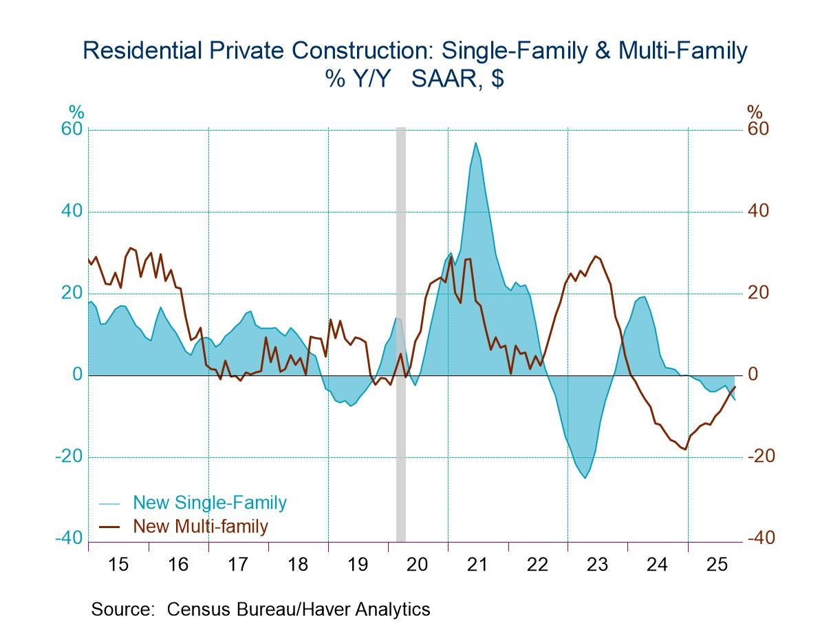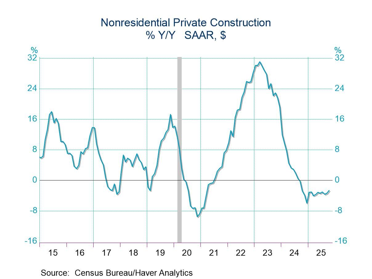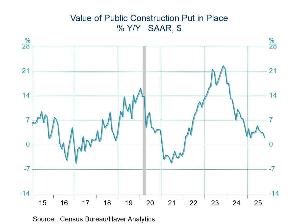 The October increase in private residential investment was due entirely to a 4.5% m/m increase in spending on improvements, its largest monthly gain since April 2024, following a 2.2% monthly decline in September. Single family construction fell 1.3% m/m in October, its eight consecutive monthly decline, while multi-family construction slipped 0.2% m/m, its first monthly decline in five months. The decline in private nonresidential construction was more than accounted for by a 0.9% m/m drop in manufacturing construction, its ninth consecutive monthly decline.