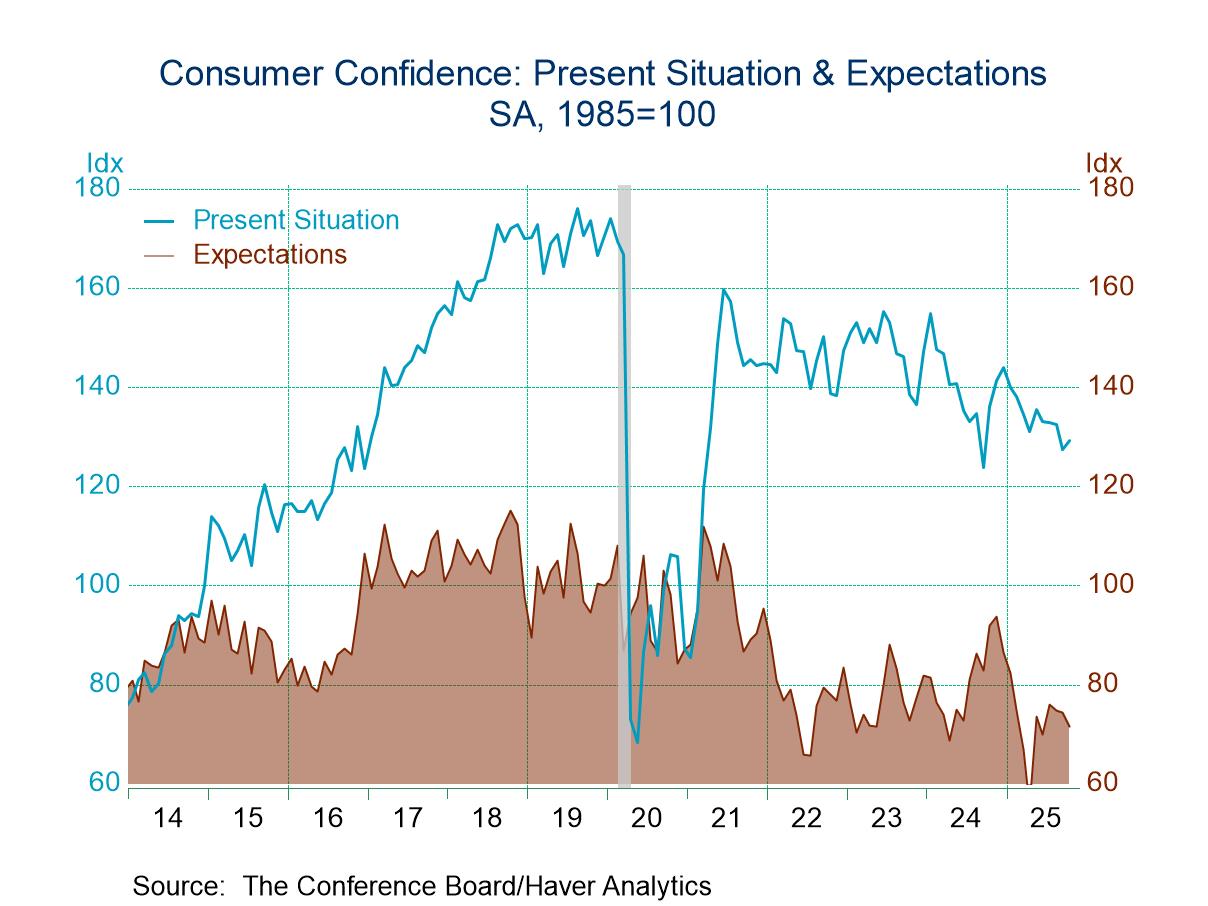 The Consumer Confidence data are available in Haver’s CBDB database. The total indexes, which are indexed to 1985=100, appear in USECON, and market expectations are in AS1REPNA.