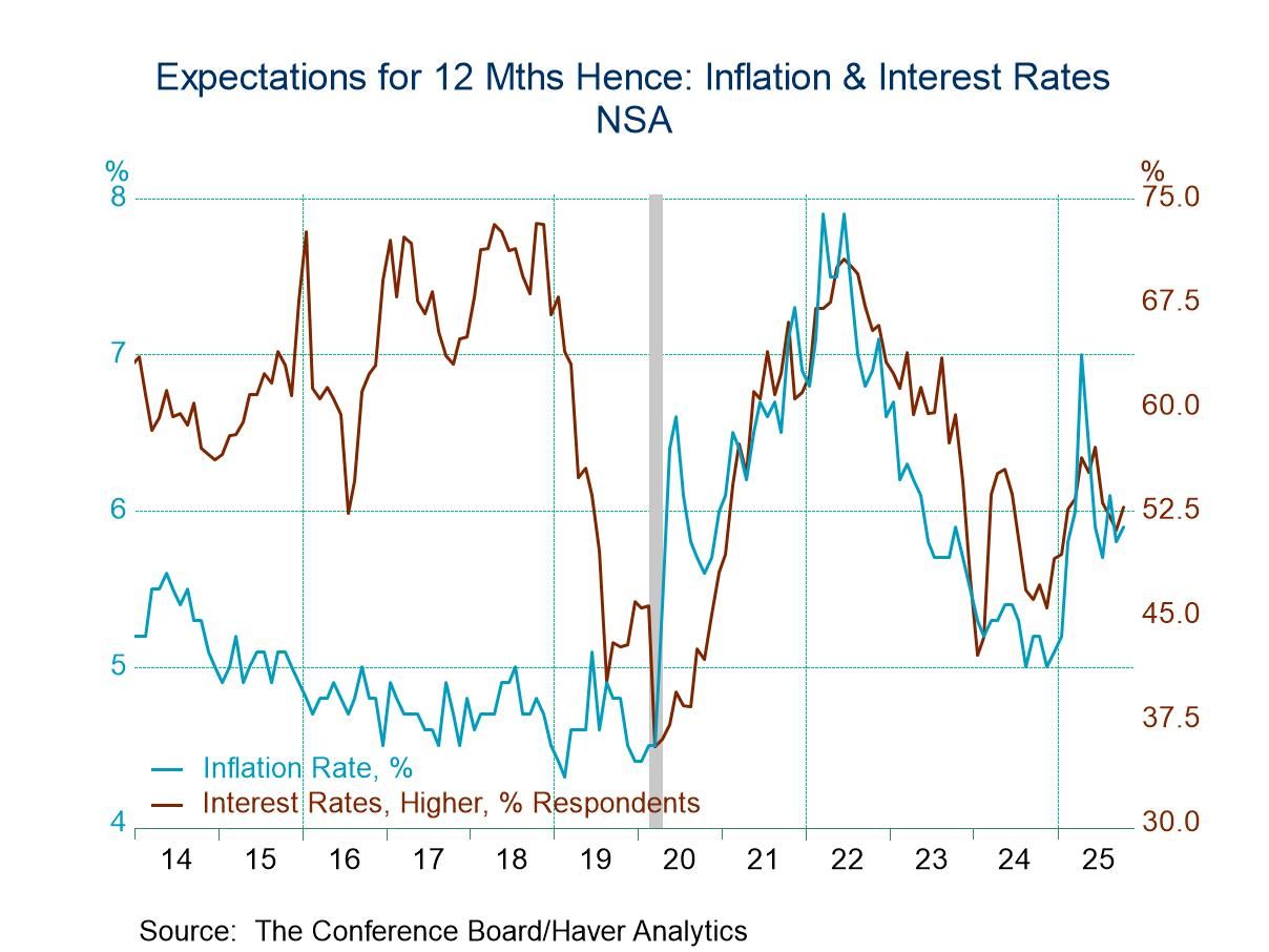 The expected rate of price inflation over the next twelve months edged higher to 5.9% in October from 5.8% in September. These remain up from a low of 5.0% last November. Fifty-three percent of respondents expect interest rates to rise this year, up from a low of 47.2% October of 2024. The percentage of respondents expecting equity prices to increase over the next twelve months held steady at 49.9%, the most since January. The percentage expecting a decline in stock prices increased to 28.5% after falling to 27.4% in September.