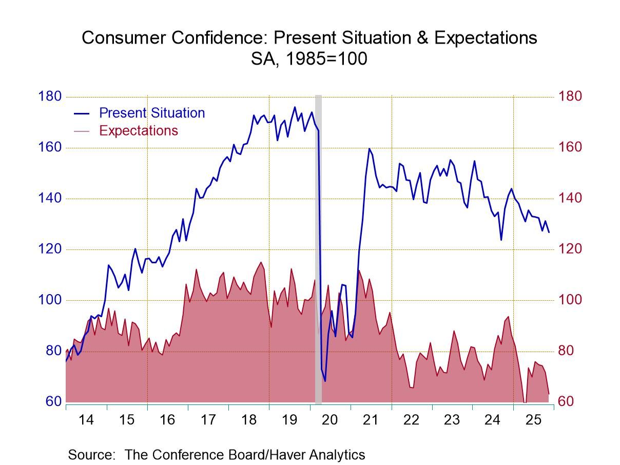 The Consumer Confidence data are available in Haver’s CBDB database. The total indexes, which are indexed to 1985=100, appear in USECON, and market expectations are in AS1REPNA.