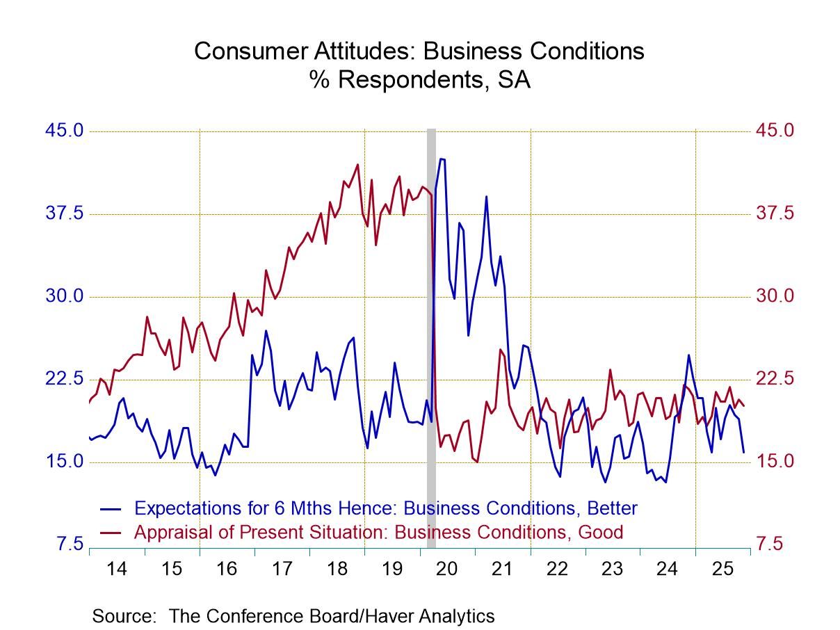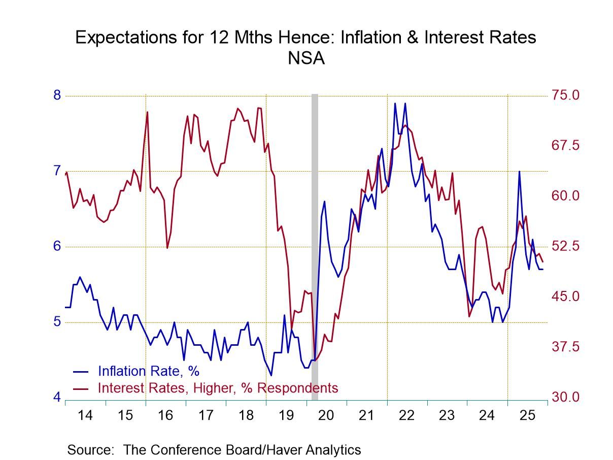 The percentage of respondents planning to buy a home fell to 4.9% this month down from a high of 6.7% in May. Plans to purchase an automobile declined sharply to 10.9% of respondents this month, down from 13.15 averaged in the fourth quarter of last year. These readings, nevertheless, remain up from a low of 10.6% in April.