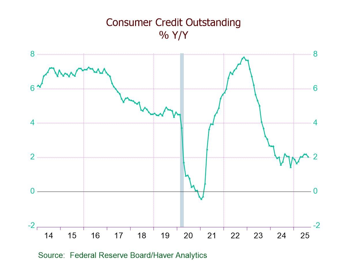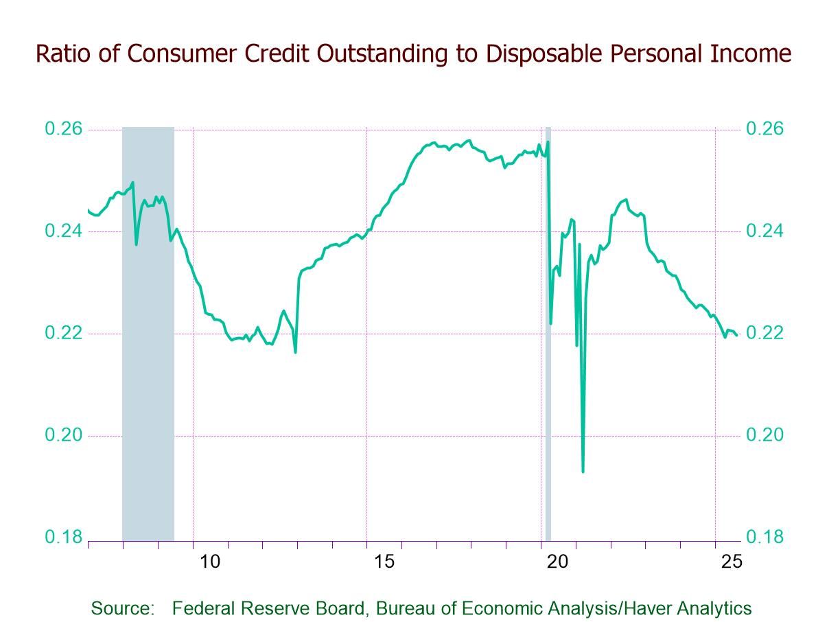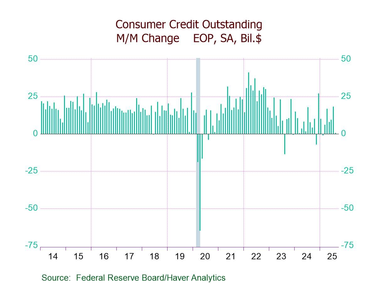 Consumer credit outstanding increased a smaller-than-expected $0.4 billion (2.0% y/y) in August following an $18.1 billion surge in July ($16.0 billion initially) and a $9.2 billion rise in June ($9.6 billion previously), data from the Federal Reserve Board showed. The August reading was the smallest m/m increase in six months, signaling cooling consumer demand. A $14.0 billion rise had been expected in the Action Economics Forecast Survey. The ratio of consumer credit outstanding to disposable personal income dipped to 22.0% in August after holding at 22.1% for three straight months.