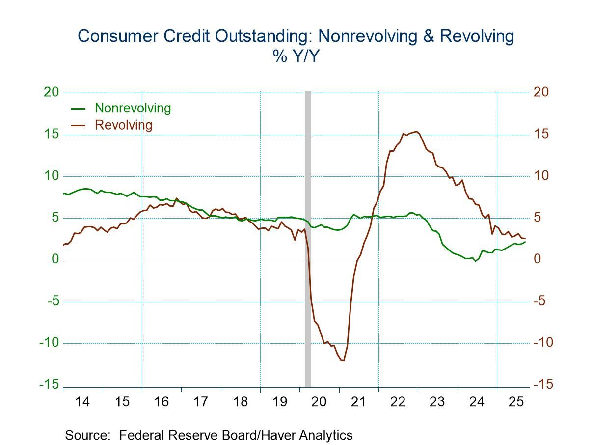 In September, revolving credit outstanding, which includes credit cards, rose $1.7 billion (2.6% y/y) after falling $6.1 billion in August, revised from a $6.0 billion decline, and rising $11.0 billion in July, revised from $11.2 billion. Revolving credit outstanding held by depository institutions fell 3.0% y/y. Revolving credit held by finance companies fell a steady 14.7% y/y in September, while credit union debt rose 4.5% y/y in September, up from 3.7% y/y in August.