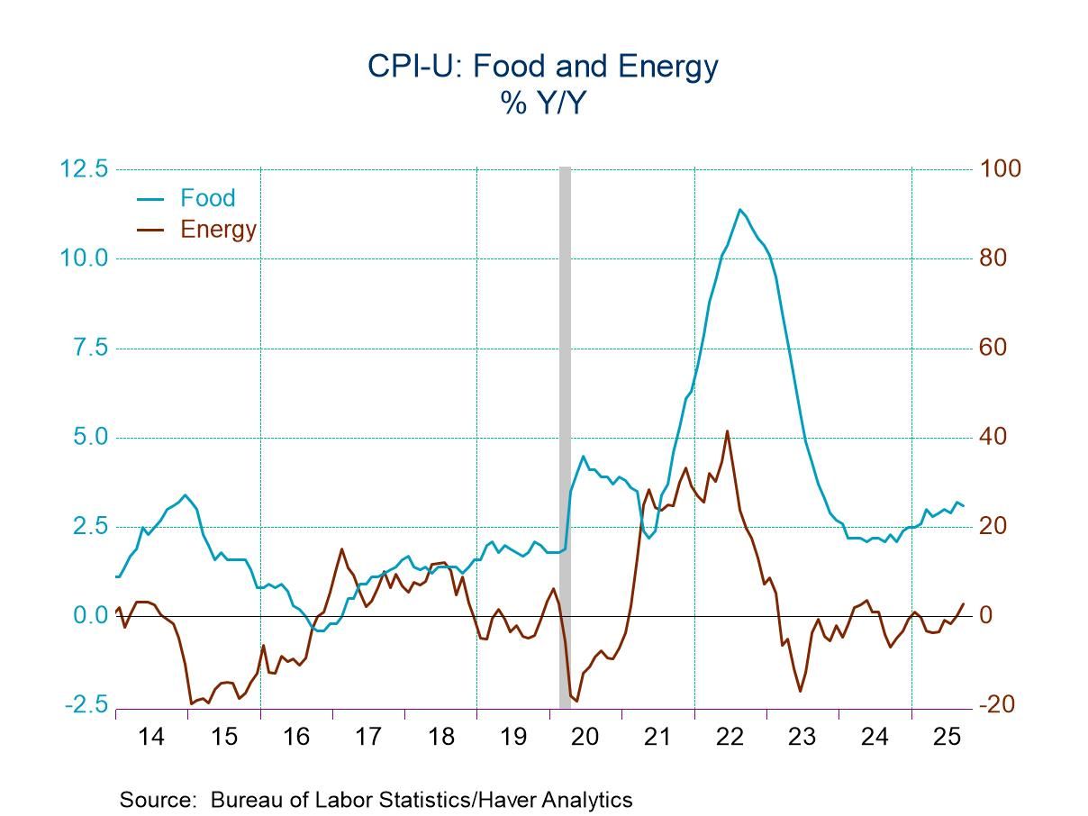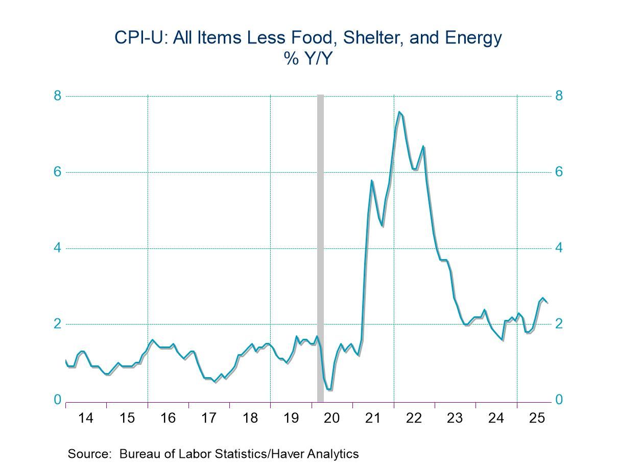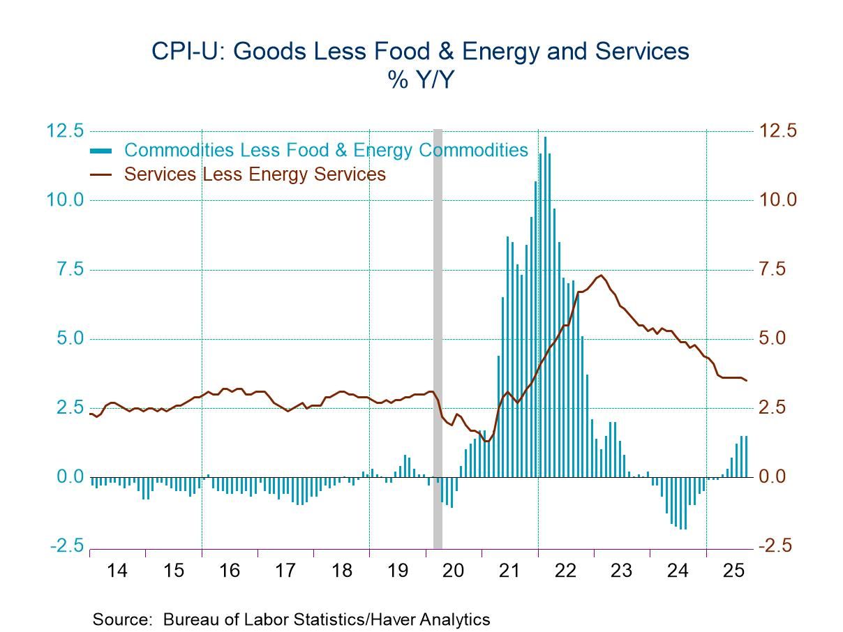 Goods prices less food and energy rose 0.2% in September after a 0.3% increase. The 1.5% y/y price rise compared to a 1.9% y/y decline in both July and August of 2024. Appliance prices rose 0.8% (1.3% y/y), after gaining 0.4%. Home furnishings prices rose 0.2% (3.0% y/y) after a 0.1% improvement in August. Recreation product costs increased 0.4% (0.8% y/y) in last month, after holding steady. Apparel prices increased 0.7% (-0.1% y/y) in September after rising 0.5%. Education & communication product costs declined 0.8% (-4.0% y/y), the third straight month of decline. Medical care goods prices eased 0.1% (NSA, +0.7% y/y) after falling 0.3% in August. Prices of used cars and trucks fell 0.4% (+5.1% y/y) last month, after rising 1.0% in August, while new vehicle costs rose 0.2% (0.8% y/y) after a 0.3% increase.