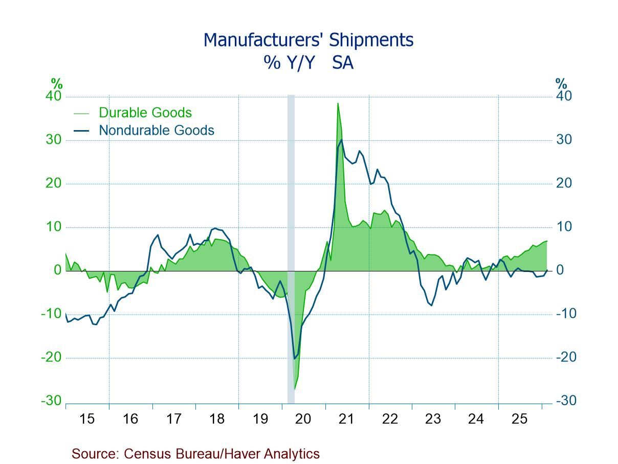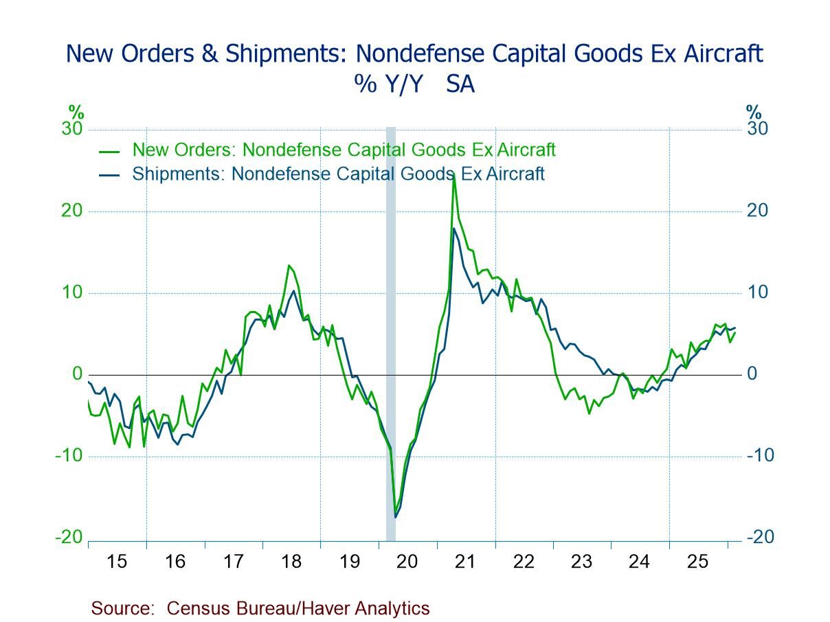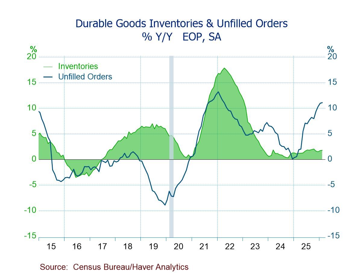 Manufacturers’ orders and shipments of durable and nondurable goods, along with unfilled orders and inventories, are compiled by the U.S. Census Bureau. They are available in Haver’s USECON database. The Action Economics forecast data are in the AS1REPNA database.
