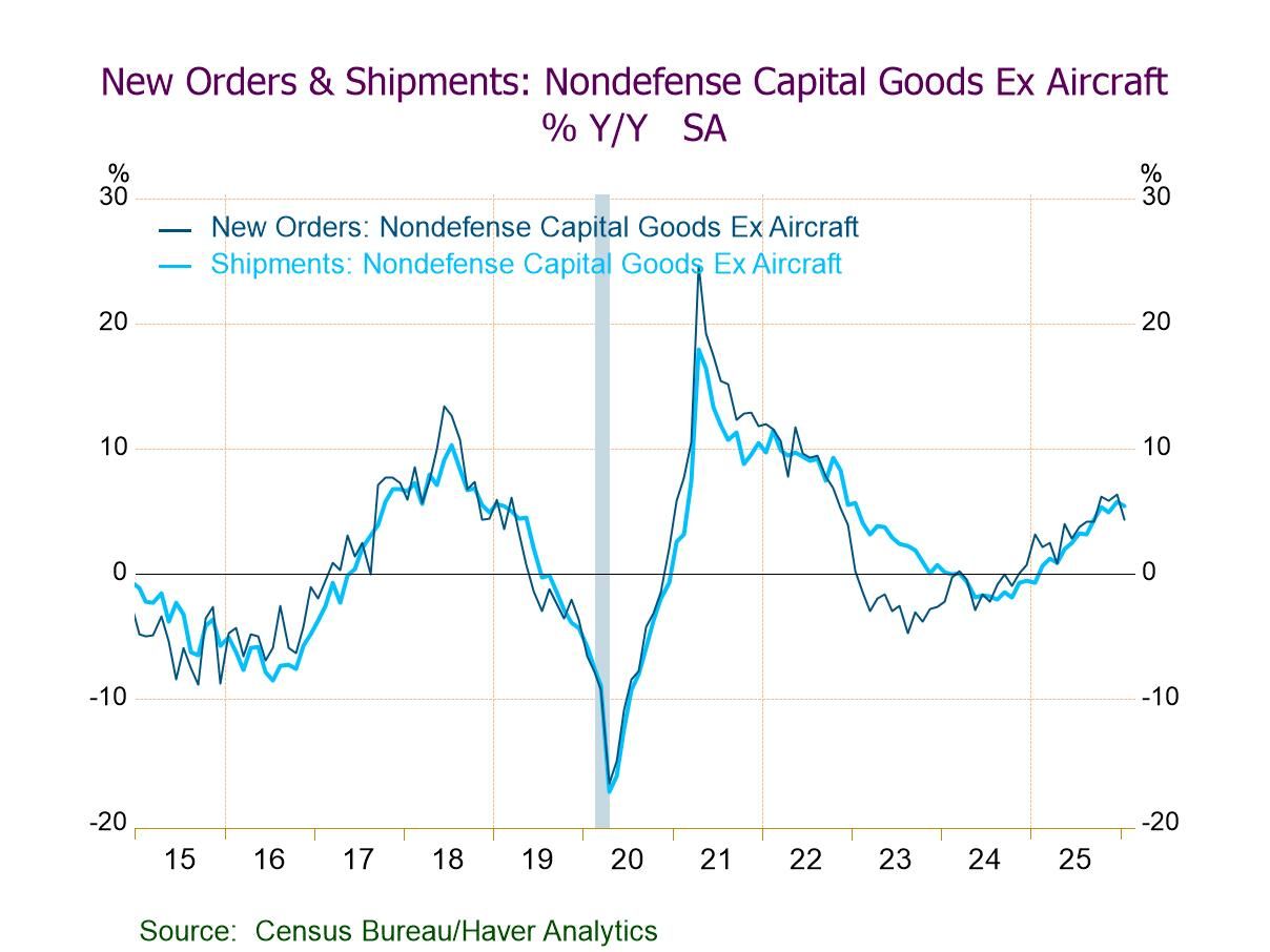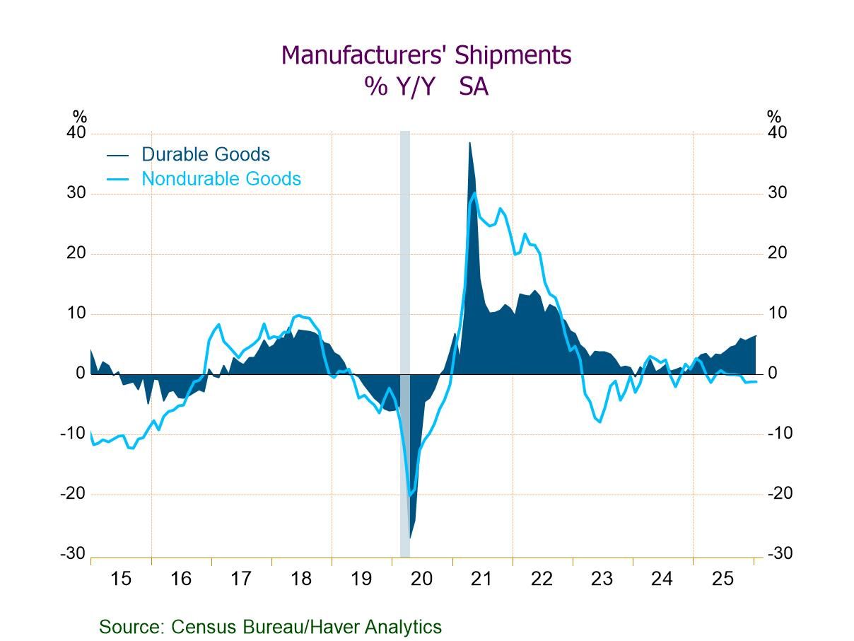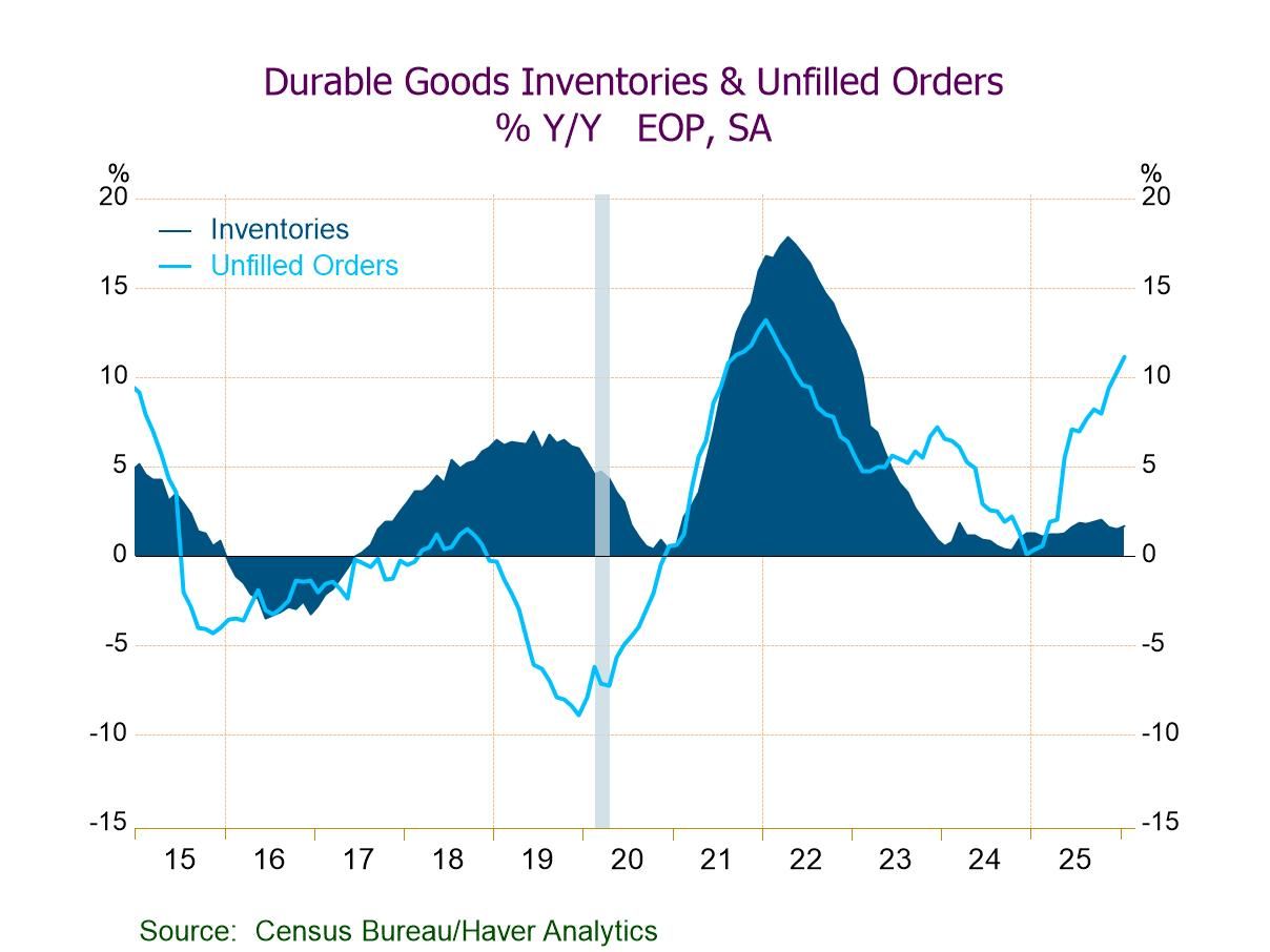 Manufacturers’ orders and shipments of durable and nondurable goods, along with unfilled orders and inventories, are compiled by the U.S. Census Bureau. They are available in Haver’s USECON database. The Action Economics forecast data are in the AS1REPNA database.