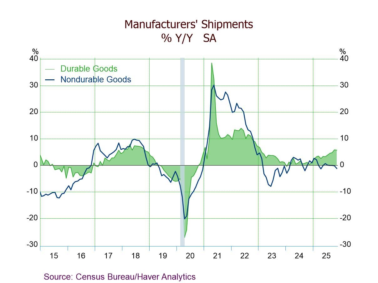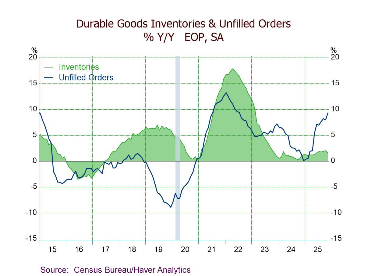 Manufacturers’ orders and shipments of durable and nondurable goods, along with unfilled orders and inventories, are compiled by the U.S. Census Bureau. They are available in Haver’s USECON database. The Action Economics forecast data are in the AS1REPNA database.