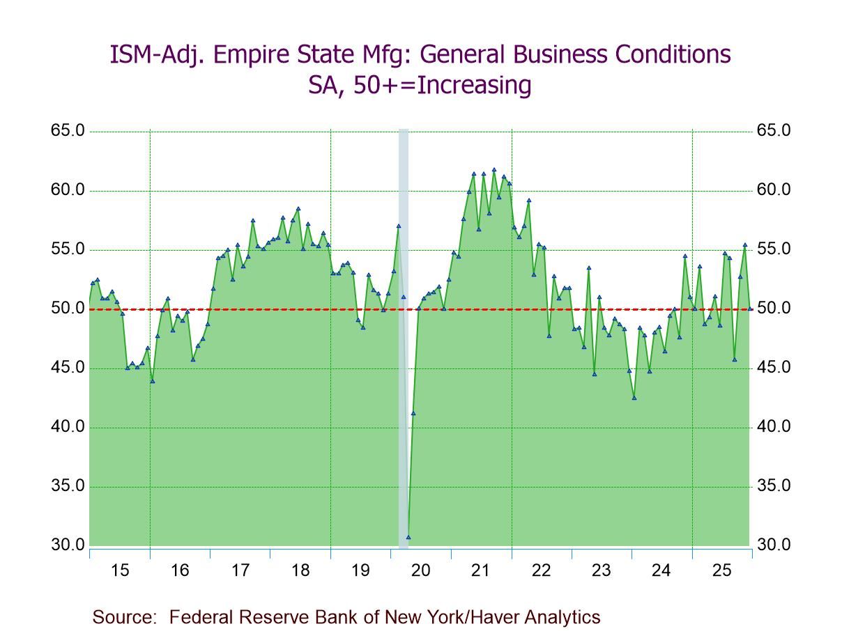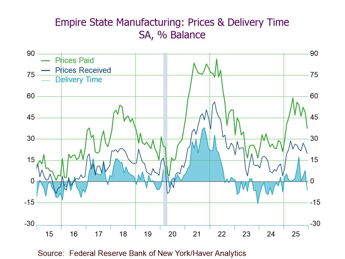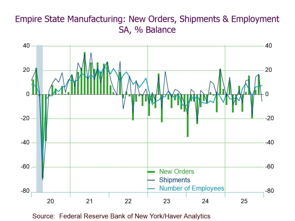 The Empire State Manufacturing Index of General Business Conditions dropped more than expected to -3.9 in December, down from 18.7 in November and 10.7 in October, according to the Empire State Manufacturing Survey released by the Federal Reserve Bank of New York. A reading of 10.7 for December had been expected in the Action Economics Forecast Survey. The December negative reading indicated that the business activity in New York State contracted for the first time since September; it was also down from 2.1 in December 2024 and a high of 20.2 in November 2024. The percentage of respondents reporting an increase in general business conditions was 31.8% in December, down from 38.7% in November; the percentage reporting a decrease was 35.7%, up from November’s 20.0%. The latest survey was conducted between December 2 and December 9.