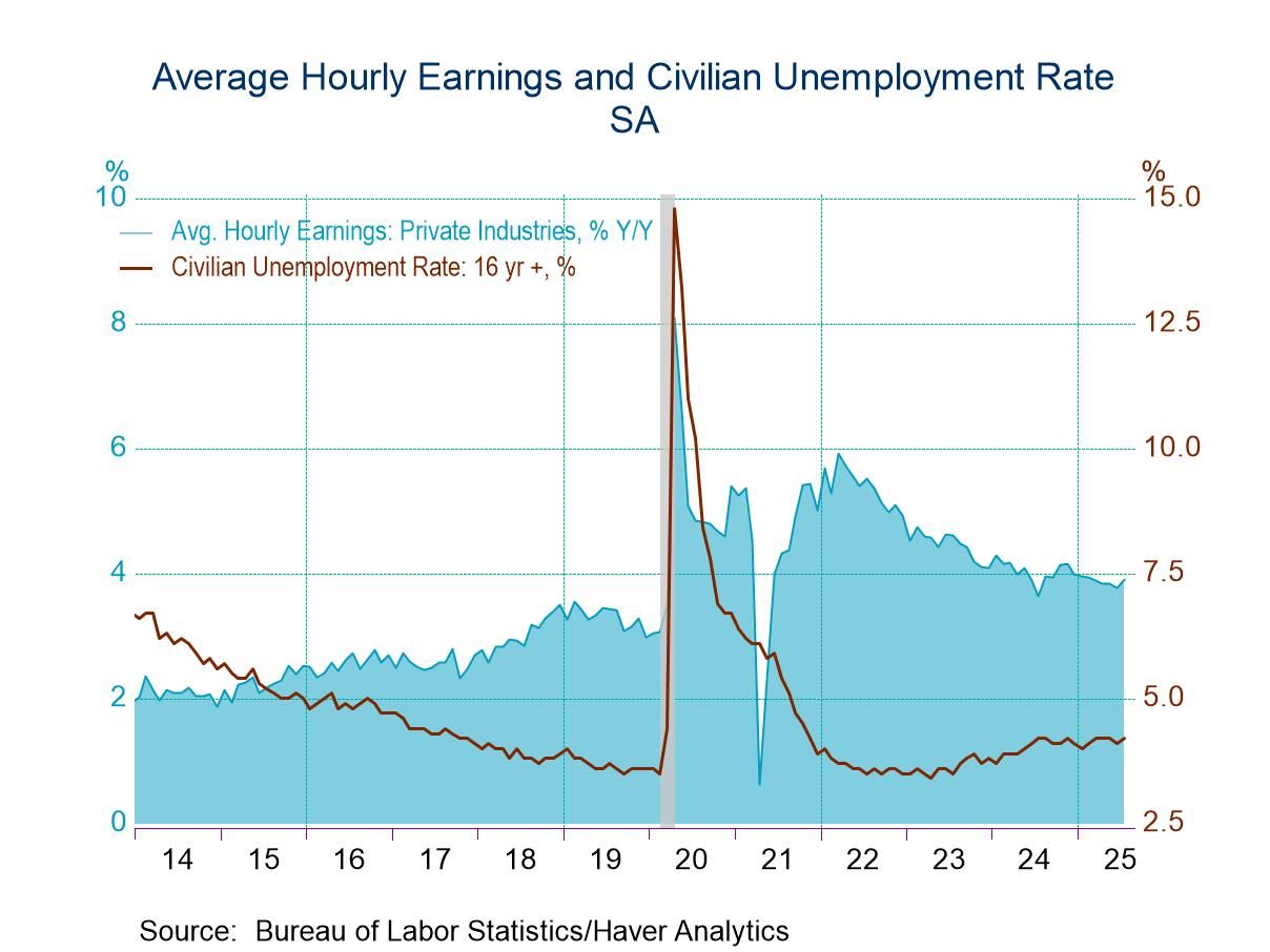 Private-sector average hourly earnings rose 0.3% (3.9% y/y) in July. Earnings in the goods-producing sector edged up 0.1% (3.6% y/y). In construction, earnings rose 0.2% (3.7% y/y) following a 0.4% rise, but factory sector earnings eased 0.1% (+3.6% y/y). In the service sector, earnings rose 0.4% (4.0% y/y) in July after increasing 0.2% in June.