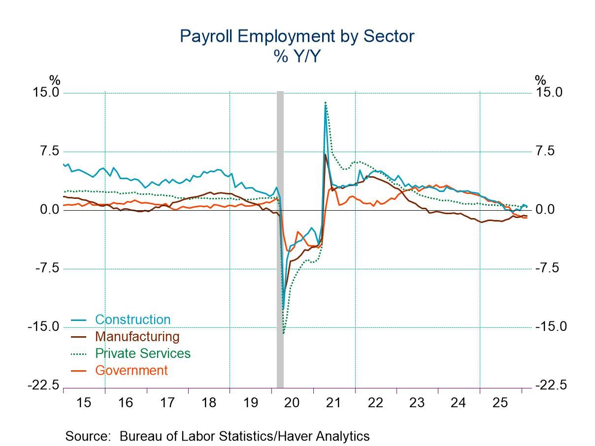 Goods-producing employment declined 25,000 in February following a 51,000 jump in January. Construction employment slumped 11,000, likely adversely affected by the unseasonably cold weather, after a surprising 48,000 jump in January. Manufacturing jobs fell 12,000 in February following a 5,000 gain in January. Manufacturing employment fell in each month in 2025, not the result that the Trump Administration new tariff policy had intended. Private service-producing employment fell 61,000, its first monthly decline since last June. Healthcare and social assistance employment, which had previously been a major support for overall employment, fell 18,600 in February, its first monthly decline since January 2022. However, part of the February decrease reflected 31,000 striking nurses in California during the survey period. Monthly declines were widespread across the service-producing sector while any gain was extremely small. Leisure and hospitality employment fell 27,000 in February on top of a 12,000 decline in the previous month.