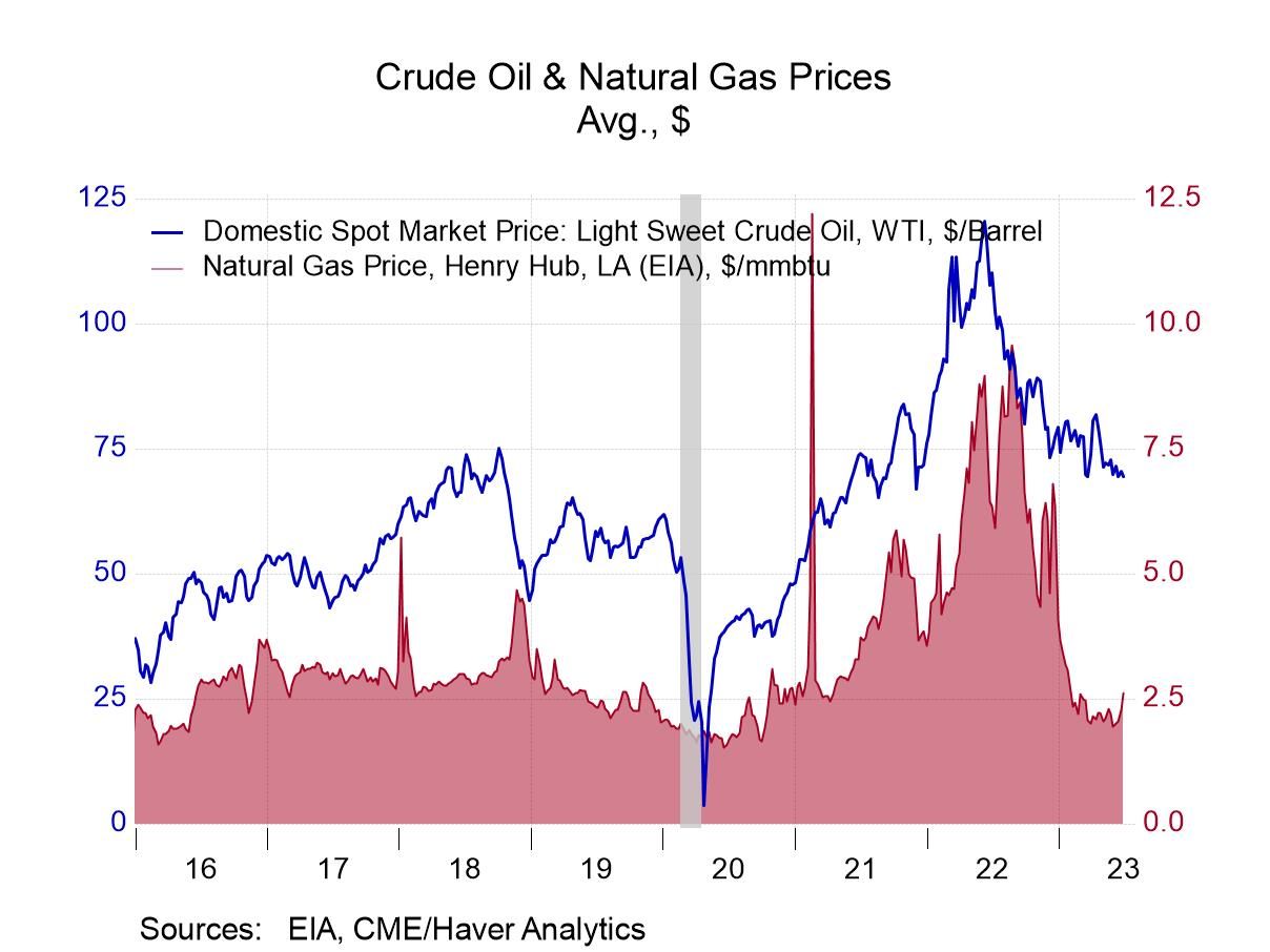 The price of West Texas Intermediate crude oil averaged $69.37 per barrel (-37.0% y/y) in the week ended June 30 versus $70.47 per barrel in the prior week. The latest price was near the recent low of $69.41 per barrel, down from the high of $120.46 in the week of June 10, 2022. On Monday, the price was $69.79 per barrel. Brent crude prices fell to $73.31 per barrel last week (-39.1% y/y) from $75.26. The recent low price for Brent was $73.89 in the week of June 2, and the recent high was $127.40 in the week of June 10, 2022. Yesterday’s price was $76.23 per barrel.