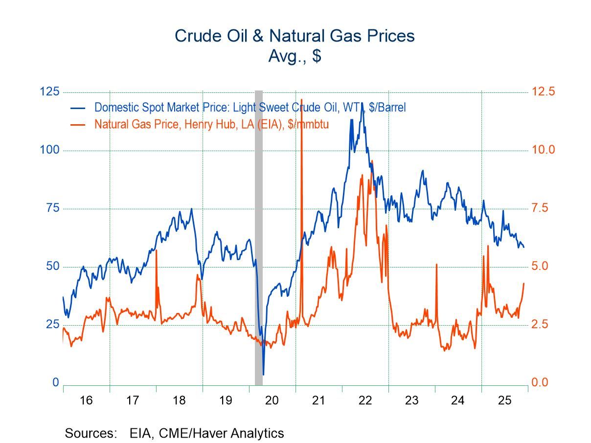 The price of West Texas Intermediate crude oil fell to an average $58.50 per barrel (-14.7% y/y) in the week ended November 28 after easing to $59.46 per barrel in the prior week. At a six-week low, prices remained under recent high of $74.17 during the third week of June. The cost of crude oil peaked at $120.46 in the week of June 10, 2022. Yesterday, the price was $59.32 per barrel. The price of European Brent crude edged higher to $64.27 per barrel (-13.3% y/y) in the week of November 28 after rising to $63.64 in the prior week. Prices remained below a recent high of $95.61 in the week of September 29, 2023 and below a peak of $127.40 in June 2022. Yesterday, the price was $64.22 per barrel.