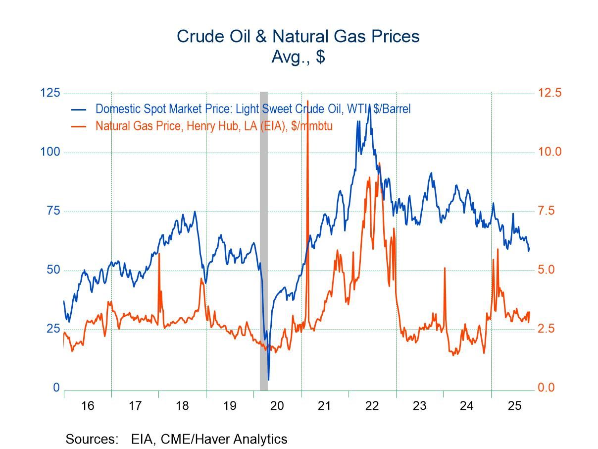 The price of West Texas Intermediate crude oil moved higher to $59.43 per barrel (-16.4% y/y) in the week ended October 24 after falling to $58.29 per barrel in the prior week. Prices remained below a recent high of $74.17 during the third week of June. The cost of crude oil peaked at $120.46 in the week of June 10, 2022. Yesterday, the price was $61.31 per barrel. The price of European Brent crude increased to $63.22 per barrel (-15.4% y/y) in the week of October 24 from $62.36 in the prior week. Prices remained below a recent high of $95.61 in the week of September 29, 2023 and below a peak of $127.40 in June 2022. Yesterday, the price was $65.52 per barrel.
