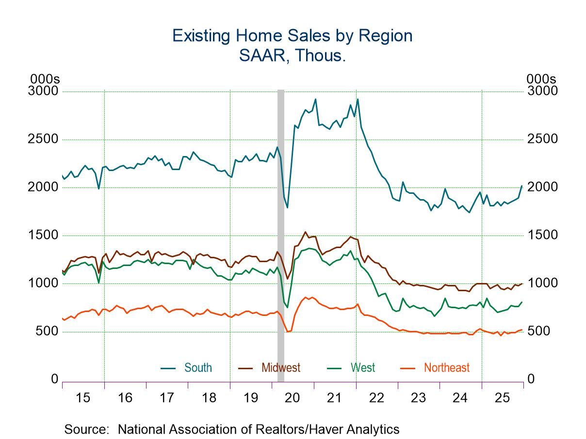 The data on existing home sales, prices and affordability are compiled by the National Association of Realtors. The data on single-family home sales extend back to February 1968. Total sales and price data and regional sales can be found in Haver's USECON database. Regional price and affordability data and national inventory data are available in the REALTOR database. Mortgage interest rates can be found in the WEEKLY database. The expectations figure is from the Action Economics Forecast Survey, reported in the AS1REPNA database.