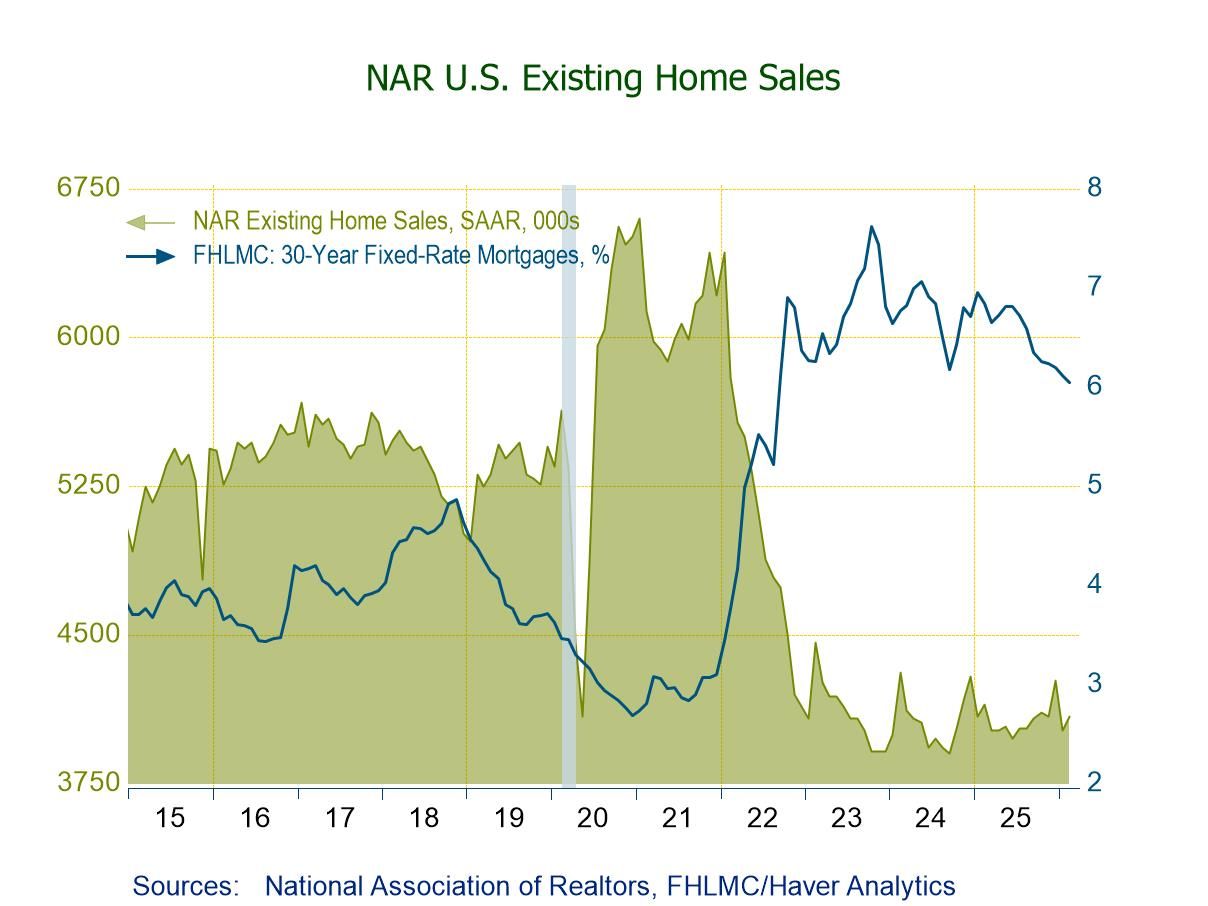 The data on existing home sales, prices and affordability are compiled by the National Association of Realtors. The data on single-family home sales extend back to February 1968. Total sales and price data and regional sales can be found in Haver's USECON database. Regional price and affordability data and national inventory data are available in the REALTOR database. Mortgage interest rates can be found in the WEEKLY database. The expectations figure is from the Action Economics Forecast Survey, reported in the AS1REPNA database.