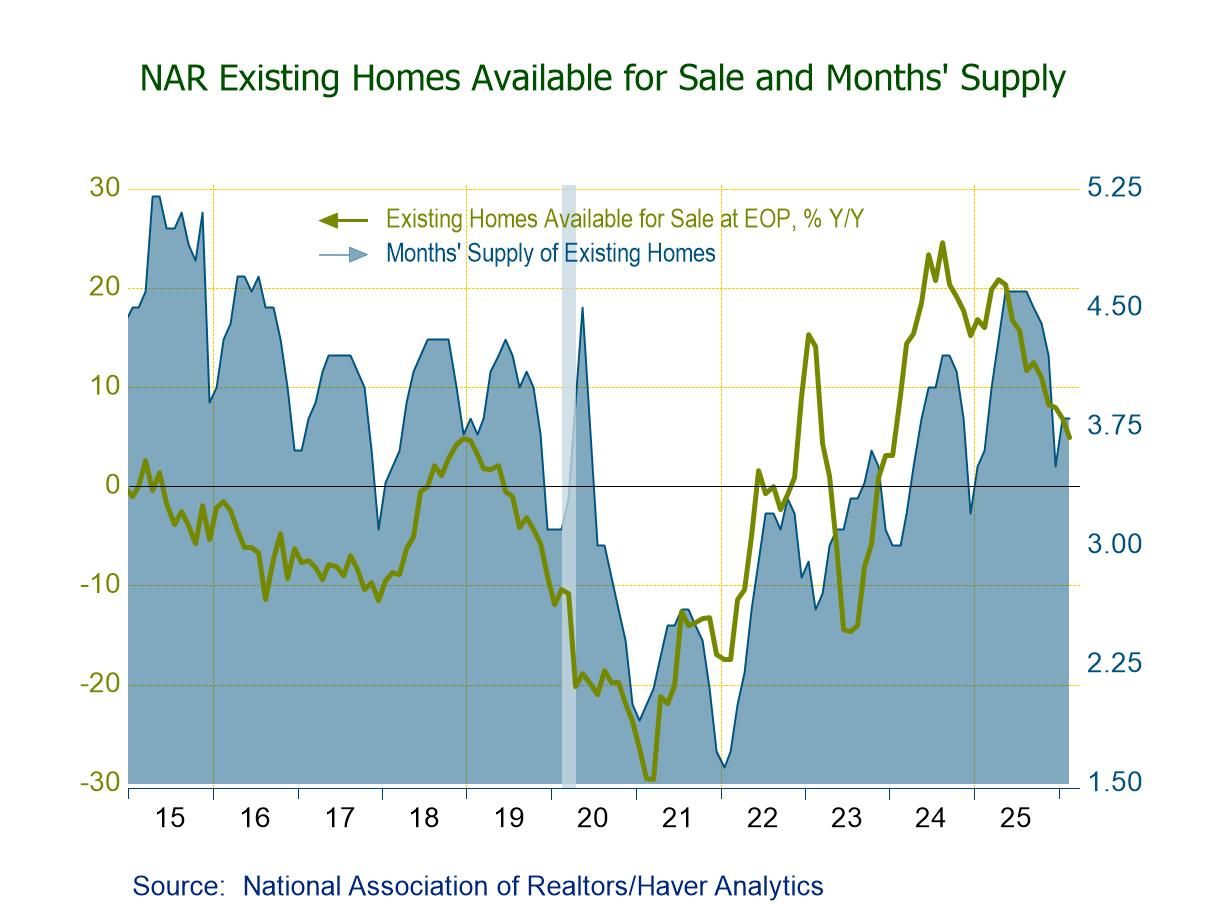 Inventories of homes for sale increased for the second successive month in February. The number of existing homes for sale (NSA) rose 2.4% (4.9% y/y) to 1.29 million units, the highest level since November, following a 2.4% January rise to 1.26 million and three straight m/m declines. The supply of homes on the market at the current selling rate (NSA) held at 3.8 months in February and January after falling to 3.5 months in December (the lowest since January 2025). The recent high of 4.6 months was in August 2025, while a record low in supply of 1.6 months was in January 2022.