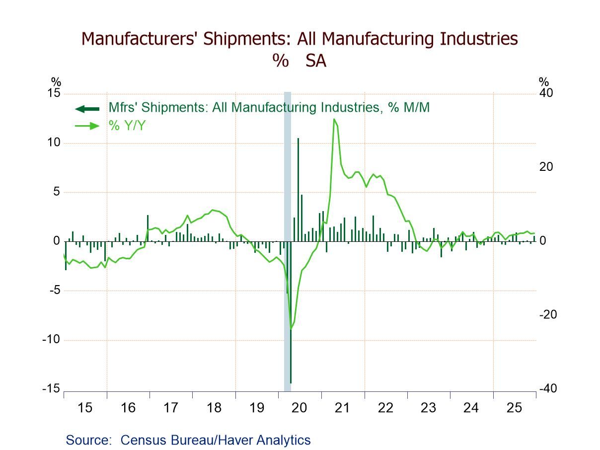 Total shipments rose 0.5% (2.2% y/y) in December, the second m/m rise in three months, following a 0.2% decline in November. Excluding transportation, shipments increased 0.4% (1.0% y/y), the third m/m gain in four months, after a 0.1% November uptick. Shipments of durable goods industries recovered 1.0% (5.8% y/y), also up for the third time in four months, after a 0.3% November decline. This reflected m/m durable goods shipments gains of 2.5% (7.2% y/y) in primary metals, 1.4% (8.8% y/y) in transportation equipment, 1.3% (8.1% y/y) in machinery, 0.7% (4.6% y/y) in fabricated metal products, 0.6% (5.1% y/y) in computers & electronic products, and 0.5% (1.2% y/y) in nonmetallic mineral products. Durable goods shipments for furniture & related products (-0.3%; +4.0% y/y) and wood products (-0.3%; -3.9% y/y) fell m/m in December, while durable goods shipments for electrical equipment, appliances & components (+2.4% y/y) and miscellaneous durable goods (+2.3% y/y) were flat m/m.