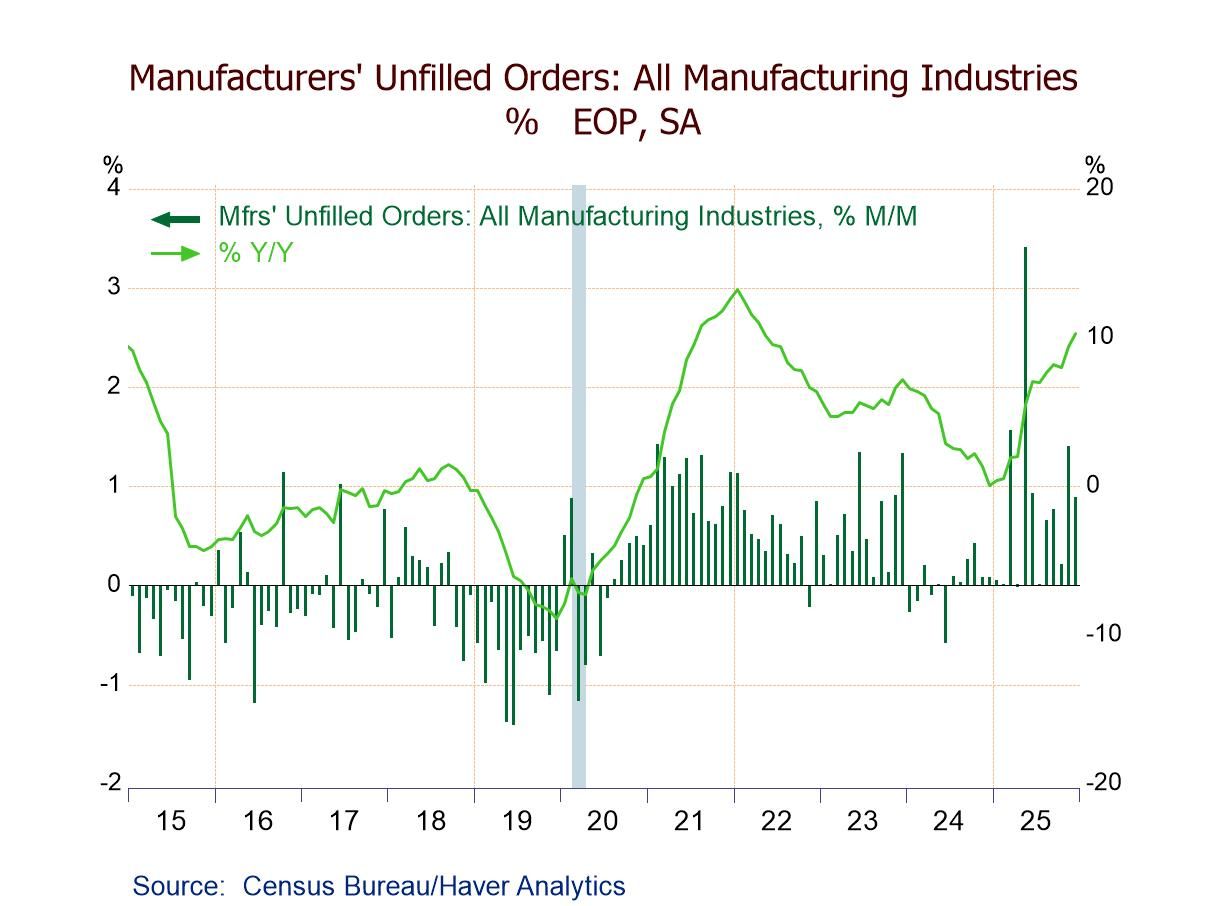- Unfilled orders +0.9%, the fifth straight m/m rise.