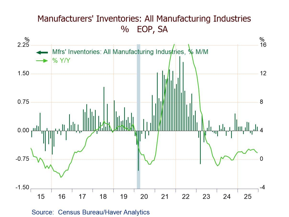 Inventories edged up 0.1% (0.9% y/y) in December after a 0.2% rise in November and no change in October. Excluding transportation, inventories inched up 0.1% (1.2% y/y), the seventh m/m increase in eight months, after a 0.1% November uptick. Durable goods inventories grew 0.3% (1.5% y/y), the third successive m/m gain, after a 0.2% November rise, while nondurable goods inventories fell 0.2% (-0.1% y/y), the third m/m fall in four months, after a 0.1% November increase.