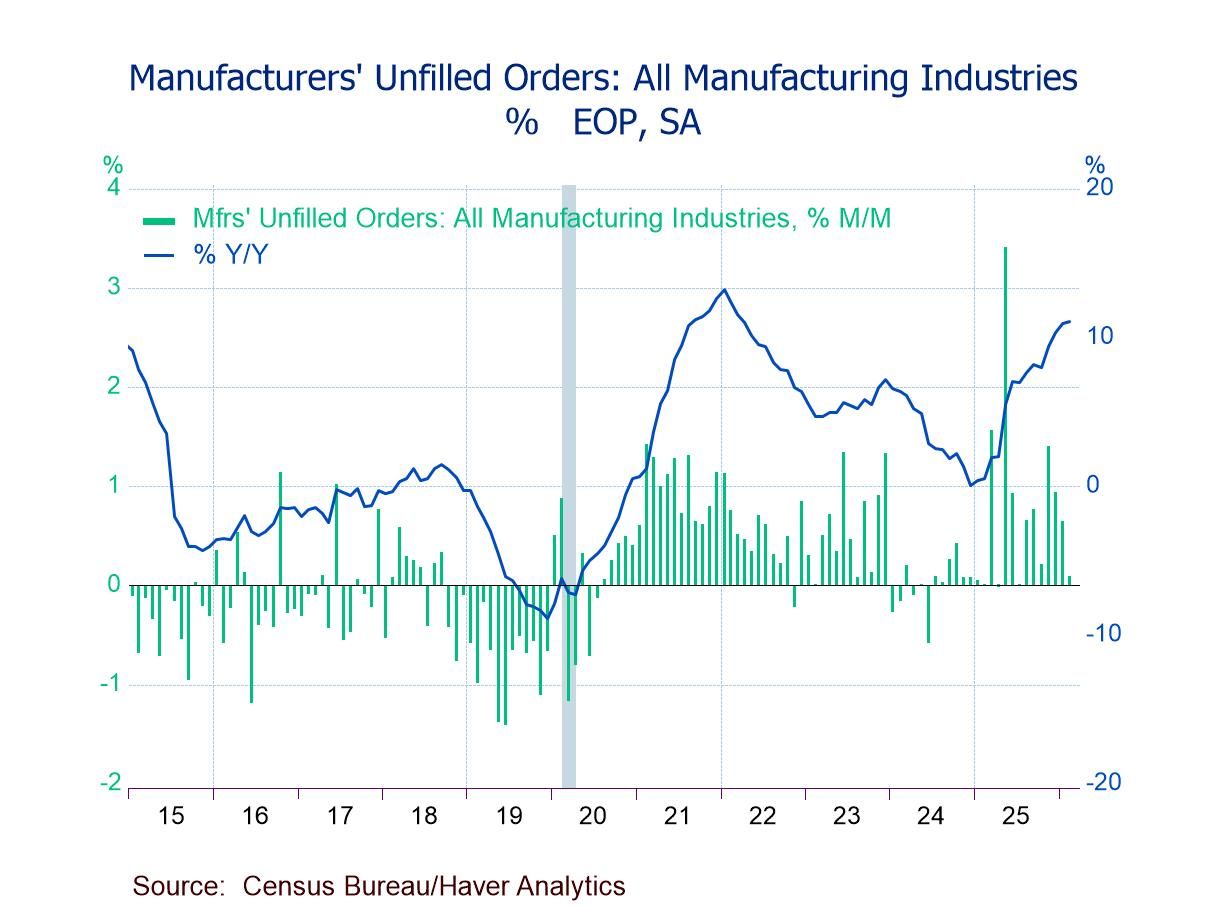 Unfilled orders edged up 0.1% (11.1% y/y) in February, the smallest of seven consecutive m/m increases, following a 0.6% rise in January. Excluding transportation, unfilled orders grew 0.2% (1.9% y/y), up for the seventh straight month, after a 0.3% January increase. Backlogs of durable goods ticked up 0.1% (11.1% y/y) in February, led by gains of 0.5% (2.0% y/y) in machinery and 0.2% (4.9% y/y) in electrical equipment, appliances & components, partially offset by declines of 0.7% (+1.5% y/y) in furniture & related products and 0.1% (+2.3% y/y) in primary metals.