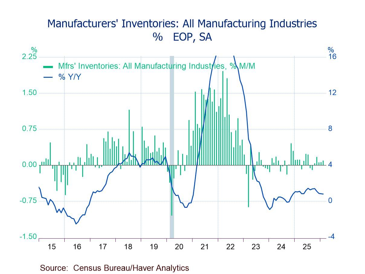 Inventories inched up 0.1% (0.8% y/y) in February, the fourth successive m/m increase, following matching 0.1% gains in January and December. Excluding transportation, inventories edged up 0.1% (1.0% y/y) after no change in January. Durable goods inventories increased 0.1% (1.8% y/y) in February after rising 0.2% for four straight months, while nondurable goods inventories were virtually unchanged (-0.8% y/y) after declining 0.3% in January and December.