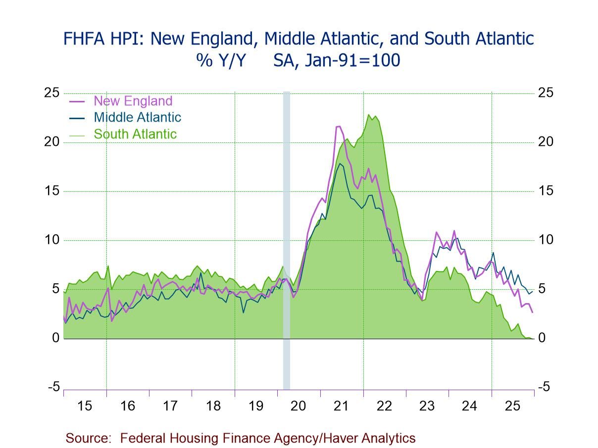 - House prices up m/m in six of nine census divisions, led by Middle Atlantic (+1.1%), but down in West South Central (-1.0%) and East South Central (-0.1%); prices flat m/m in Pacific.