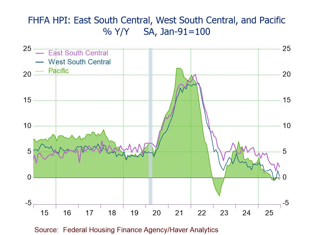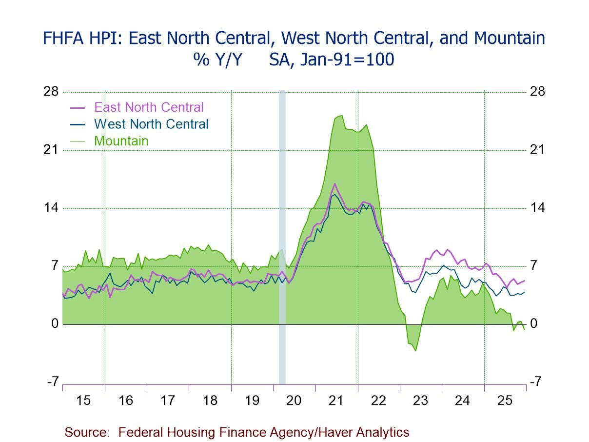 - House prices up y/y in six of nine regions, led by East North Central (+5.2%), but down in Mountain (-0.6%), Pacific (-0.4%), and South Atlantic (-0.1%).