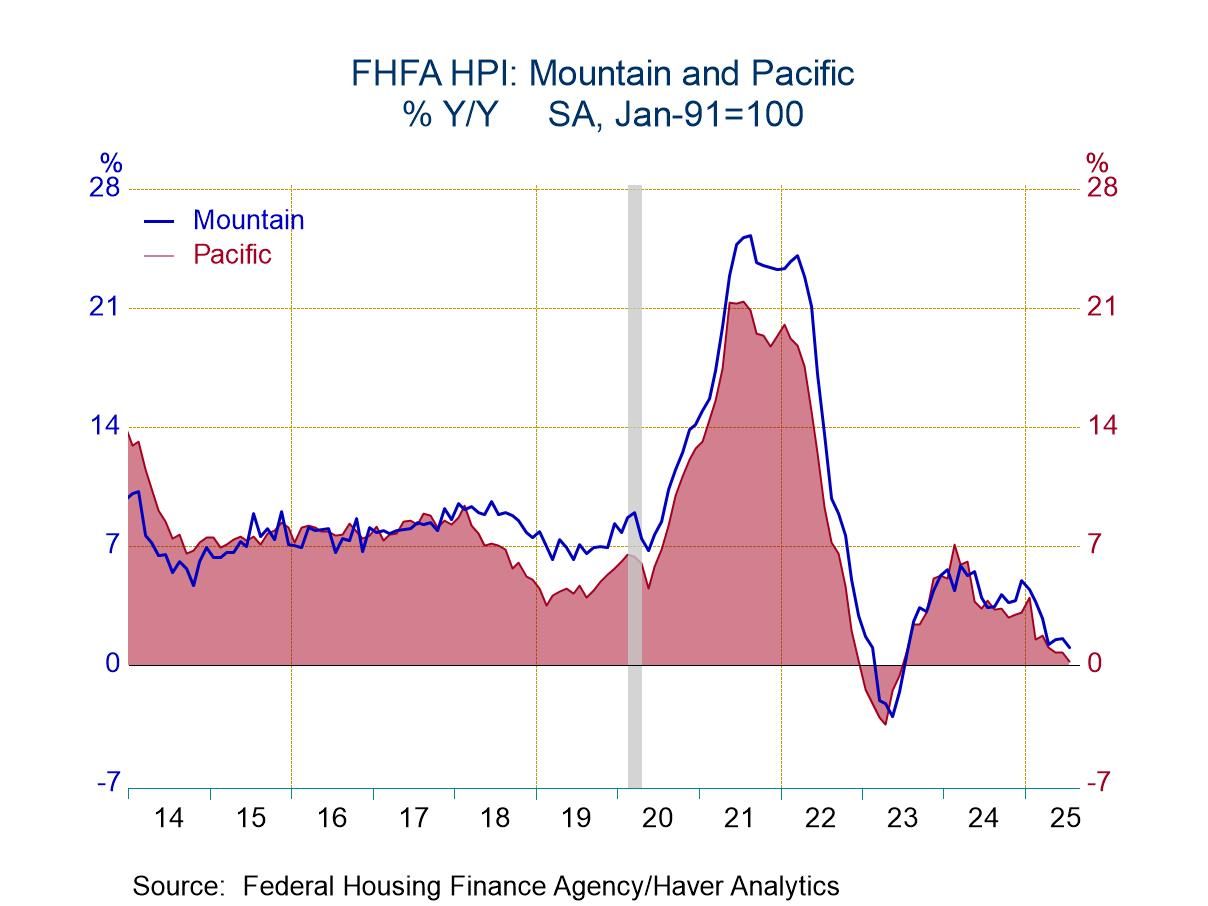In the South Atlantic region, house prices were unchanged in July and rose 0.8% y/y. House prices in the East North Central region improved 0.3% (4.1% y/y) after two monthly declines, while in the West South Central region, prices rose 0.2% (1.7% y/y), up for the third straight month. In the Pacific region, house prices also were 0.2% higher both m/m and y/y, following five straight months of decline.